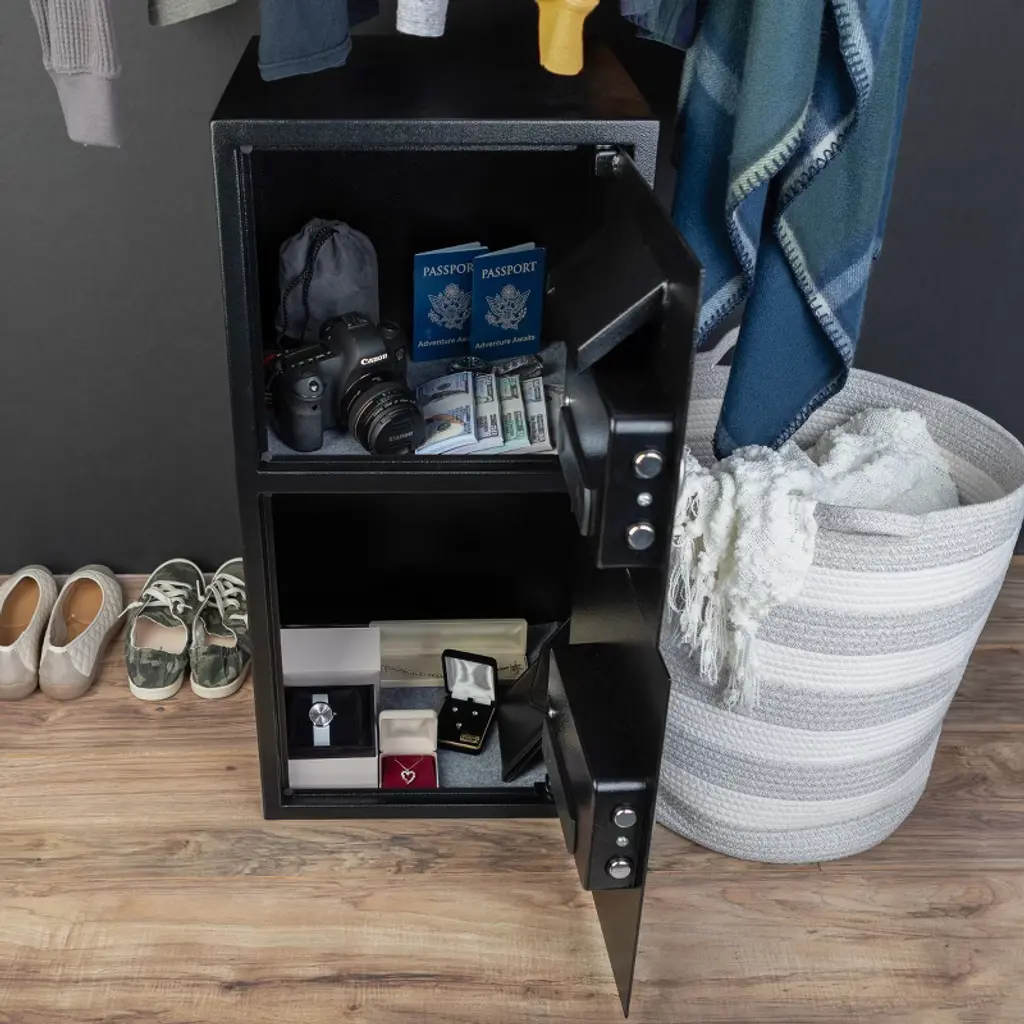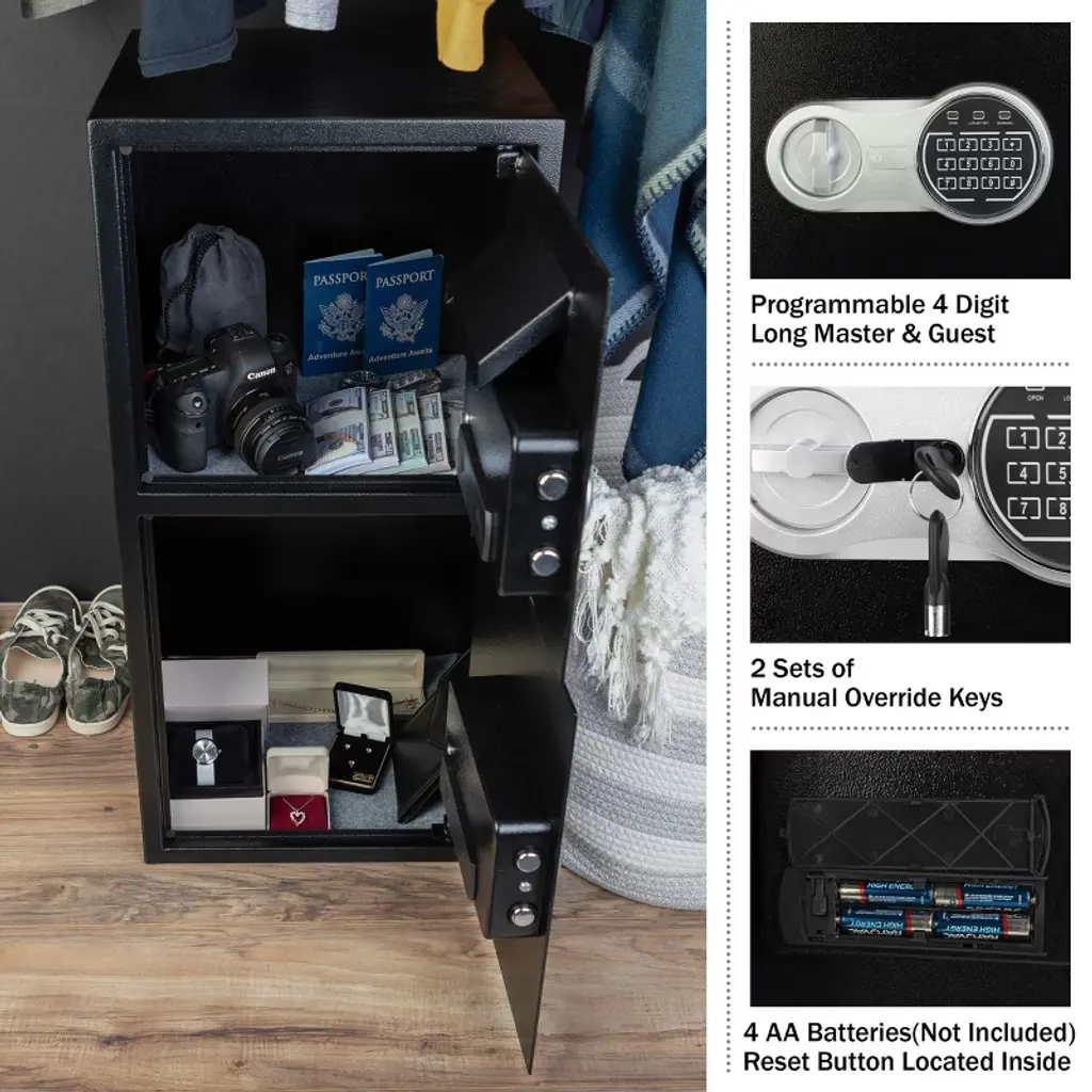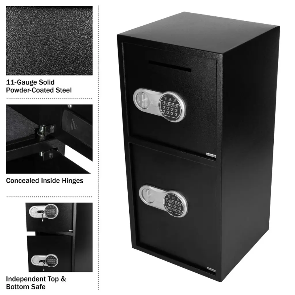 Protect your cash or documents with the Electronic Safe Deposit Box by Paragon Safes. This password protected money lock box is ideal for your home or business, designed with a front deposit slot so you can safely store cash or coin bags. The cash safe box can be mounted to the floor or wall for added security and comes with two sets of manual override keys so that you can always retrieve your money out of the small lock box safe when needed.