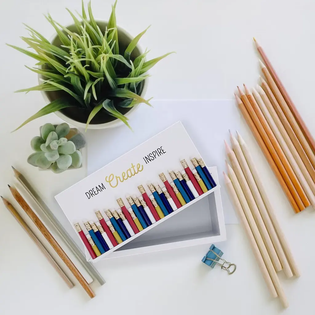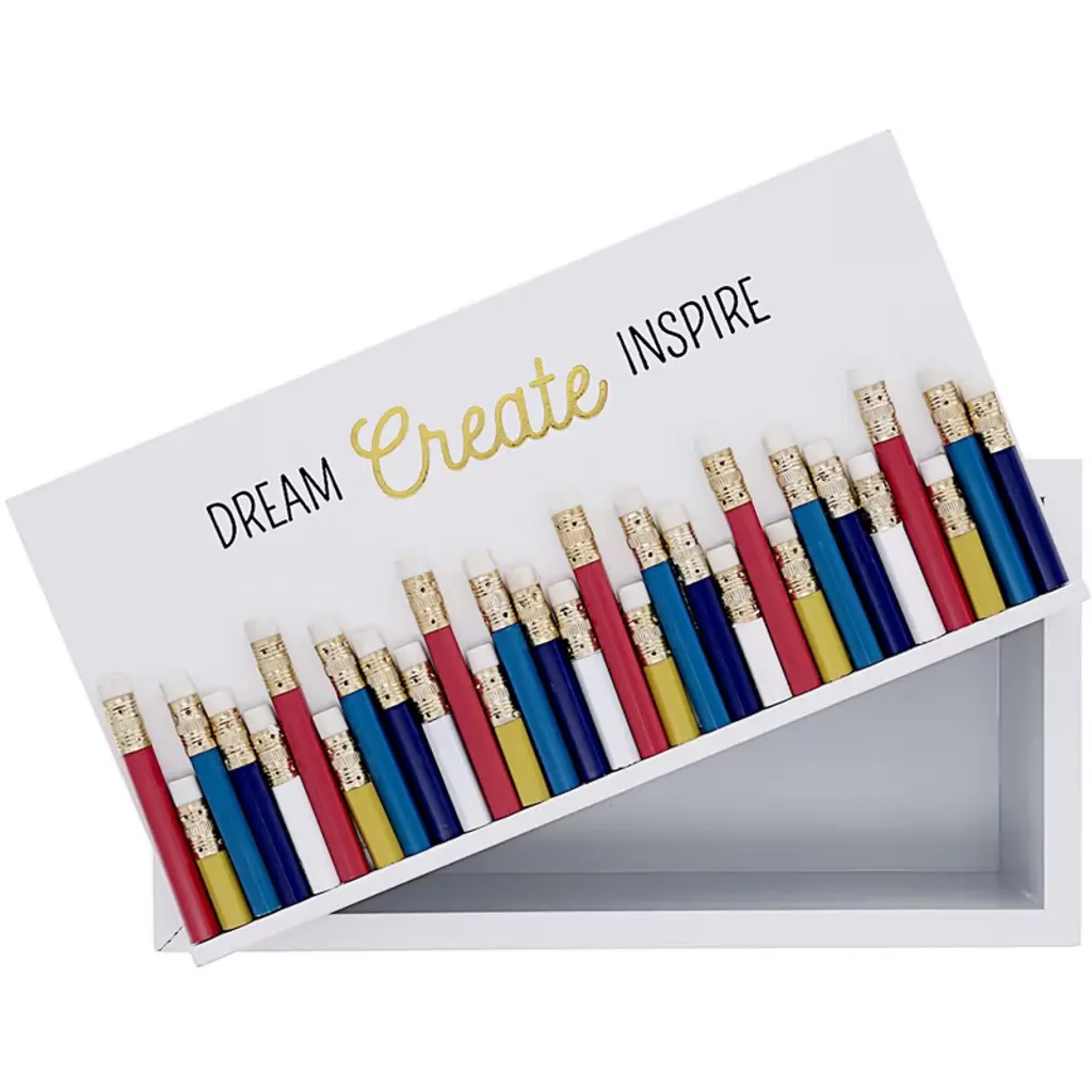 The Pavilion "Dream Create Inspire" supply box is not just a practical storage solution; it's a heartfelt homage to the invaluable role teachers play in shaping young minds. Crafted from high-quality MDF, this sturdy container measures 8.75 inches in length, with dimensions of 4.5 inches in both height and width. Its lid is a work of art in itself, adorned with real chopped glossy pencils and secured erasers, serving as a charming reminder of the tools of the teaching trade. But the sentiment emblazoned on the lid truly captures this piece's essence: "Dream Create Inspire." This message, presented in a combination of metallic, sparkly, and matte finishes, speaks volumes about teachers' lasting impact on their students' lives. Beyond its aesthetic appeal, this versatile storage box offers practical functionality for educators of all disciplines and levels. Whether organizing pencils, pens, markers, crayons, or storing classroom supplies, it's a reliable companion for teachers in their daily endeavors. Moreover, its multipurpose design makes it suitable for various applications, serving as a mini prize or candy bucket for classroom rewards, a personal item holder for desk essentials, or even a decorative accent to brighten up any workspace. Ideal for gifting, this supply box is a thoughtful token of appreciation for teachers across all educational settings, from elementary to college levels. Its bright, cheerful design will bring joy to any recipient as a constant reminder of their impact on their students' lives. Easy to maintain, it can be wiped clean with a dry cloth, ensuring its longevity and pristine appearance. Packaged securely in a die-cut box, it arrives safely for shipping, ready to delight educators and education enthusiasts alike. As part of Pavilion's extensive range of teacher-oriented gifts and classroom-themed items, it stands as a testament to the enduring bond between educators and their students, celebrating the profound influence of a good teacher that can never be erased.