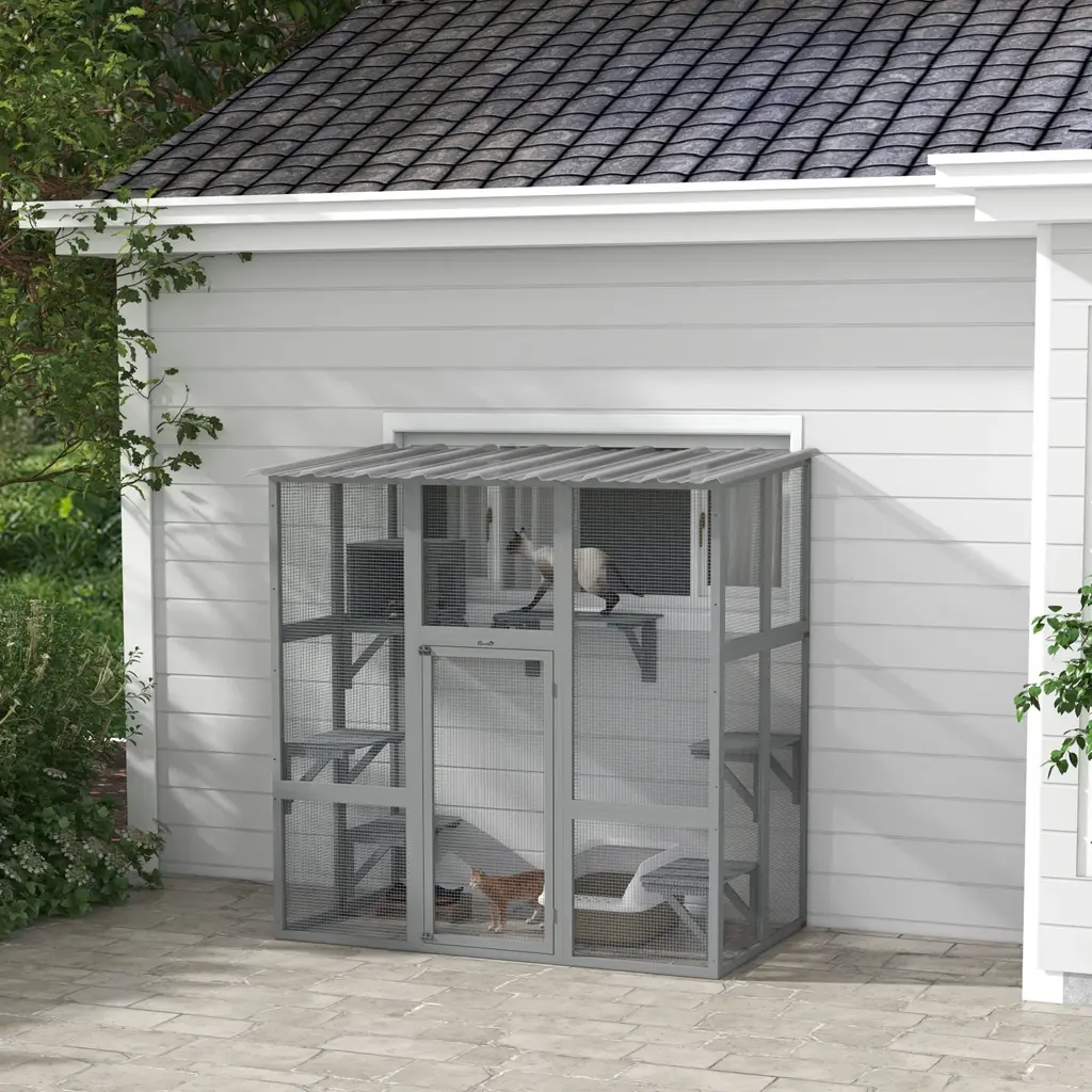 Pawhut Catio, Outdoor Cat Enclosure Window Box, Wooden Cat House Playground With Scratching Posts, Weather Protection Roof - Grey