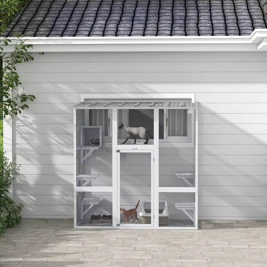 Pawhut Catio, Outdoor Cat Enclosure Window Box, Wooden Cat House Playground With Scratching Posts, Weather Protection Roof - White