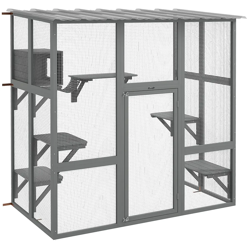 Descriptions:Welcome to your cat's new favorite spot - a spacious outdoor catio. This cat patio is an outdoor cat shelter with a solid wooden structure. Your furry friend will love lounging on the different platforms and napping in the cozy cat box. Plus, you can feel good knowing your cat is safe and secure. Upgrade your cat's outdoor experience today with this stylish and functional cat enclosure cat cage today.Features:● Installation against the wall, connecting the inside and outside● Multiple jump platforms● An inner resting box for playing and lounging● Scratching posts keep nails healthy● Covered with a PC board and built from solid fir wood to ensure stability● Outside cat enclosure houses two cats, each up to 10 lbs.● A walk-in door for pet parents● Assembly requiredSpecification:● Color: Orange● Materials: Fir Wood, PC Board, Steel● Overall Dimensions: 67.7" W x 35.5" D x 70.5" H (Without Roof)● Inner: 66.1" W x 34.6" D x 70.5" H● Front Eave Height: 67.3" H● Coverage Area: 18ft²● Platform: 16.7" L x 11.8" W (Side), 23.6" L x 1.2" W (Middle)● Platform Height: 12.2", 28.7" H● Cat Box: 16.8" L x 11.8" W x 11.8" H● Door: 19.9" W x 42.1" H● Bridge: 19.3" L x 7.9" W● Weight Capacity: 22 lbs. (Each Platform)● Grid Size: 0.5" L x 0.5" W● Item Label: D32-024V00OG● Note: No back panel, lean against-the-wall design with L-shaped brackets and expansion screws for secure installation