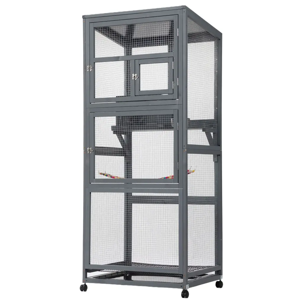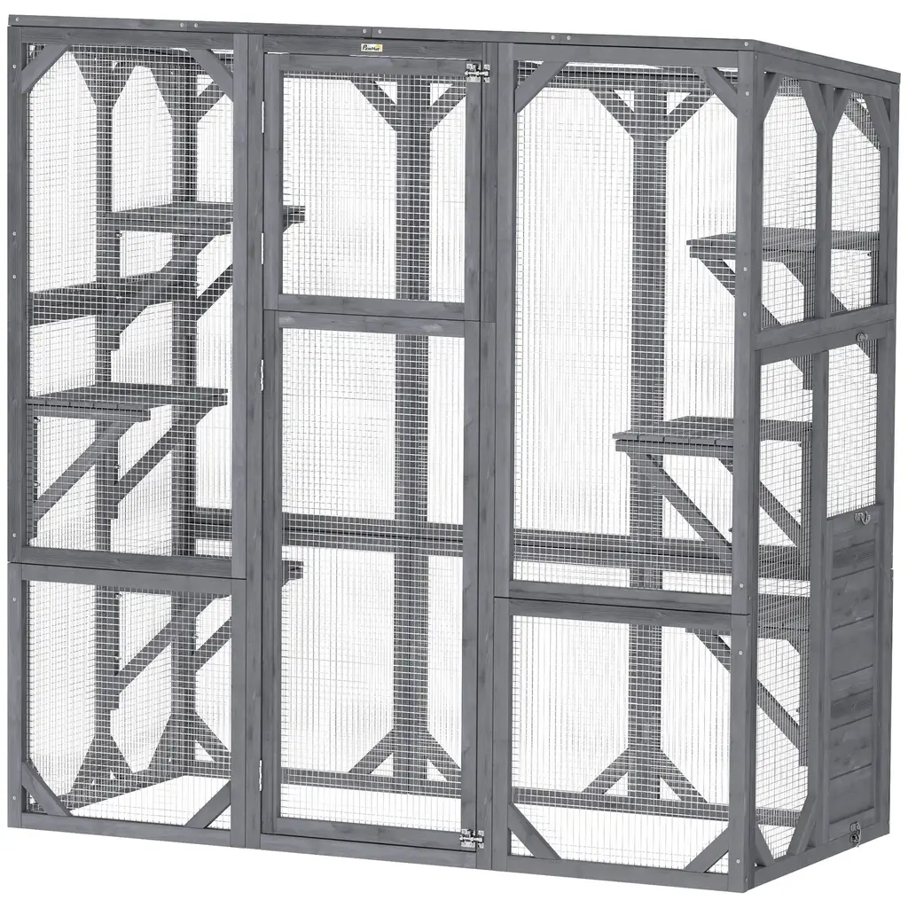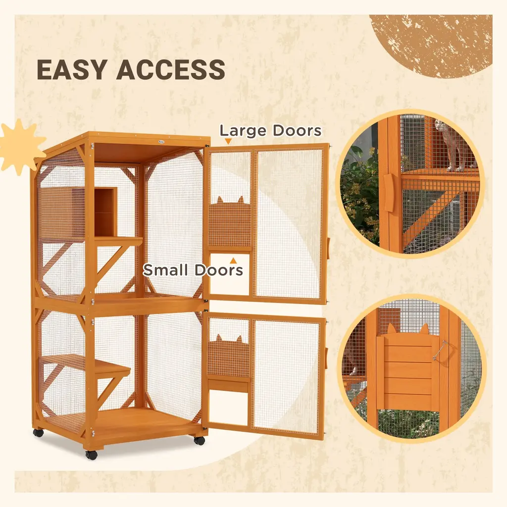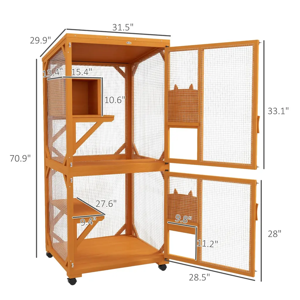 High Places: This cat condo features a resting box high off the ground to nap several feet up, and three places to jump up from including a long ledge. When they go to find a favorite spot to nap, they'll love the upper attic of the box.Rolling: A swift-rolling, quick-to-shift-around queen of cat houses for outdoor cats, this habitat moves effortlessly when it's in the way, or when you want to rearrange things. The metal wire structure is a four-wheeled friend of portability.Large: Big enough for up to 3 cats, this cat box enclosure offers large, wide open stories to play in. Size and roominess are everything. From climbing to napping, this spacious play cage will bring extra fun into the house. The structure comes with 2 large doors in front, making it easy for your kitties to get in and out.Indoor & Outdoor: Designed for indoors and outdoors, this cat cage playpen stays strong against showers or fits nicely in a room. The asphalt roof protects against rainwater to outlast weather patterns, and the steel mesh wire keeps your pets from being harmed by animals. Use the wheels to roll it inside when winter comes and you still want the cats to use it.Big Cat House Information: Overall Dimensions: 31.5" W x 30" D x 70.75" H. Door Dimensions (From Top to Bottom): 28.5" W x 33" H, 28.5" W x 28" H. Assembly Required.