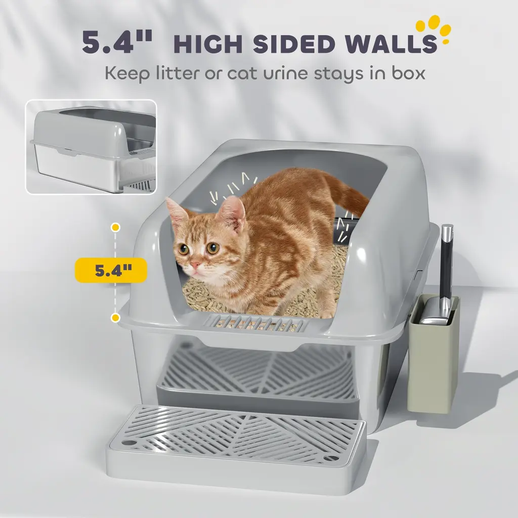 Descriptions:Discover the sleek PawHut stainless steel kitty litter box, where practicality meets elegance! Its 5.4-inch high side walls contain messes, and the robust stainless steel tray makes cleaning a breeze. Plus, the unique double-tracking sand system reduces sandy paw prints, making your life easier.Features:● 5.4-inch walls control litter spillage and urine leakage● Buckle connections simplify assembly and keep durability● Stainless steel tray facilitates quick and easy cleaning● Entrance and drop area and step reduce paw tracking● Includes stainless steel scoop and storage box● Tray dimensions accommodate cats up to 10 lbs.● Assembly required, enhancing product integritySpecification:● Color: Light Gray● Material: ABS, Stainless Steel● Overall Dimensions: 23.7" L x 16" W x 11.4" H● Litter Tray: 23.4" L x 15.6" W x 6" H● Tray Sand Drop Area: 5.4" L x 2" W● Scoop: 9.8" L x 4.3" W x 1.6" H● Storage Box: 5.4" L x 2.4" W x 5.1" H● Sand Drop Step: 12.7" L x 6.3" W x 1.6" H● Item Label: D31-114V00LG