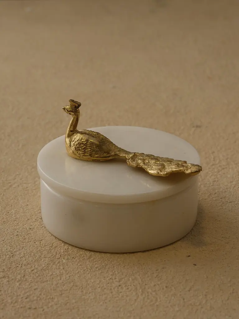 Exuding opulence and grace, the White Marble Peacock Storage Box with Gold Lid is a decorative treasure inspired by nature's most regal bird. The smooth white marble body is topped with a stunning gold-tone peacock, its feathers sculpted in intricate detail to reflect light and captivate attention. Whether displayed on a vanity, shelf, or entryway table, it offers refined storage with a sense of wonder and elegance—perfect for those who appreciate timeless beauty with a luxurious twist.