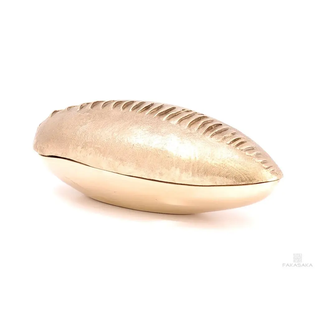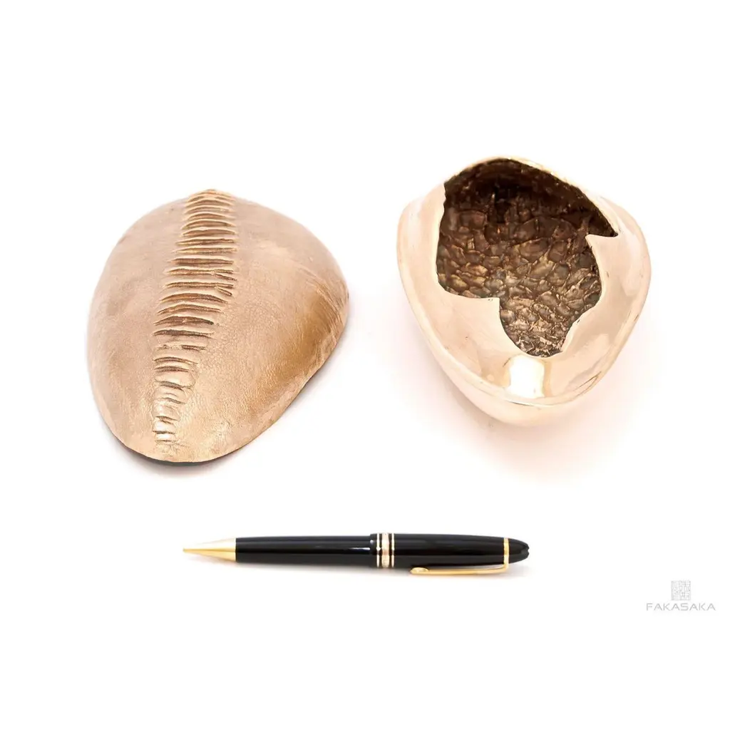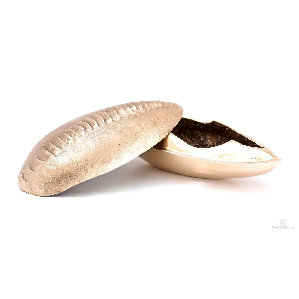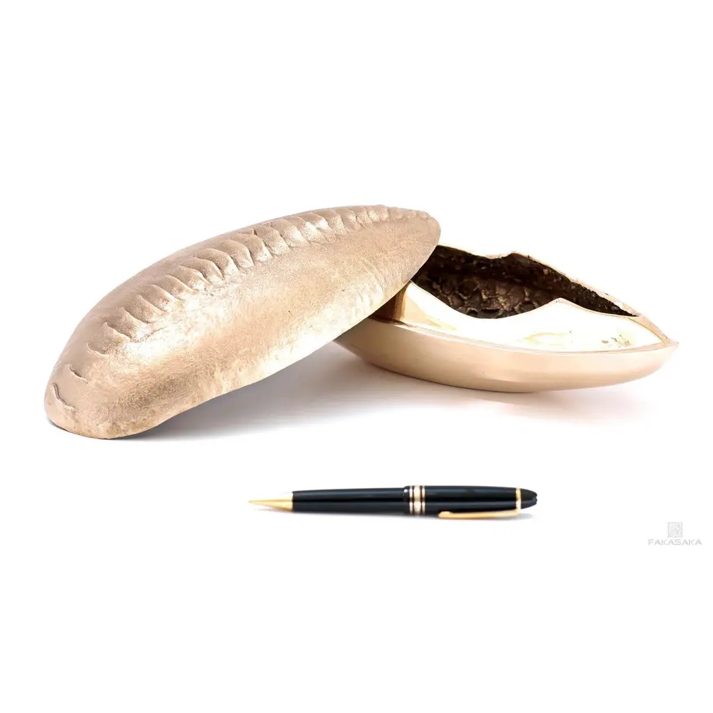 Pearl box by Fakasaka design.Dimensions: W 26 cm D 14 cm H 9 cm.Materials: polished bronze. Fakasaka is a design company focused on production of high-end furniture, lighting, decorative objects, jewels, and accessories. Established in 2007, Fakasaka is the eponymous design company by Brazilian artist Fernando Akasaka distinguished by a penchant for producing intricate detailed cast bronze collectible design objects, furniture and jewelries. Fakasaka explores the contrast between the manmade and the natural through shapes and finishes that create a clear aesthetic. The constant challenge to balance elements is met with an outcome that is a striking assortment of bronze furniture and objects in oxidised and polished finishes, accented with precious regional stones, granites and rich prehistoric reptilian motifs.
