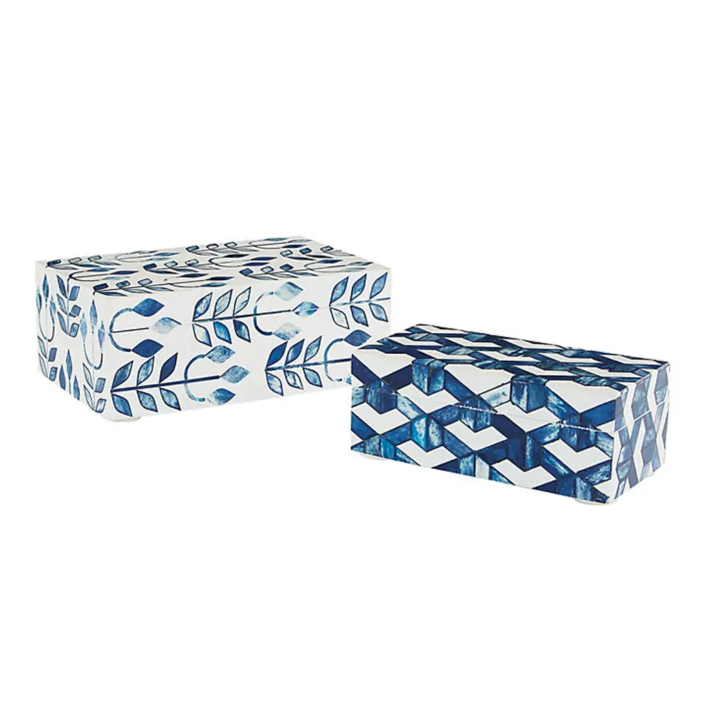 These decorative storage boxes offer a fresh take on classic blue and white. Our Petunia Decorative Boxes are handmade of found bone and set into clean white resin to create geometric floral and lattice designs bursting with vibrant blue hues. We love these nested boxes displayed on a living room table, desk, or bookshelf to add eye-catching color and quick hidden storage. Because each box is handmade using natural materials, expect unique variations in tone and shading. Petunia Decorative Box features: