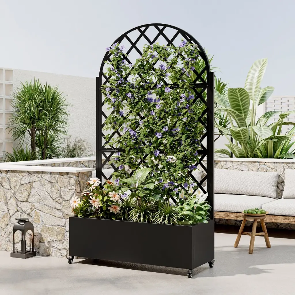 This innovative Trellis with Planter Box not only provides an excellent space for growing plants or vegetables, but its screen panels also add decorative elegance and support for climbing vines. It is made from durable galvanized metal, ensuring it can withstand harsh temperatures without cracking. Additionally, it offers a practical solution for hiding outdoor equipment like air conditioners.