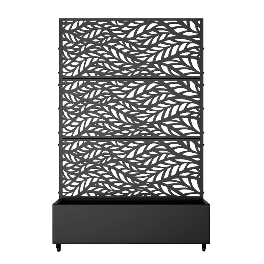 Pexfix 72 In. X 47 In. Outdoor Metal Trellis With Planter Box In Leaf Pattern In Black