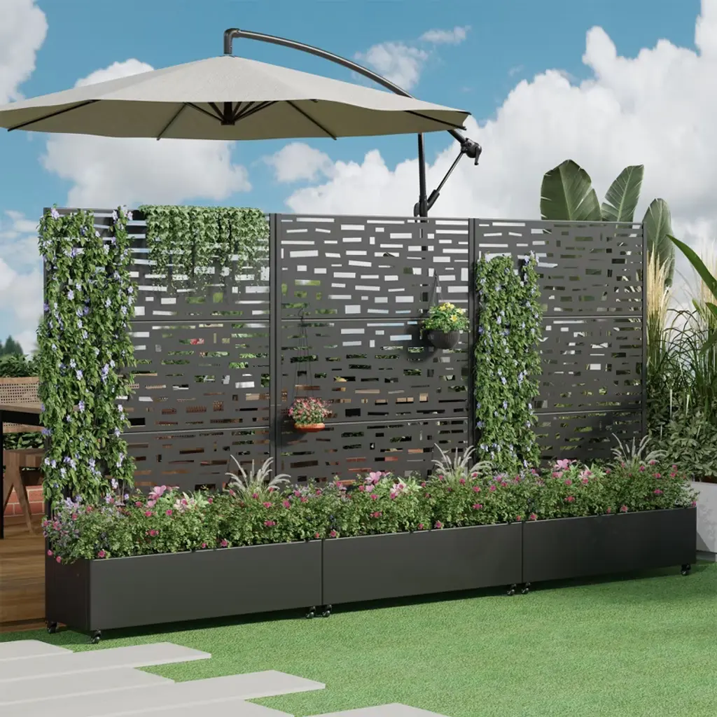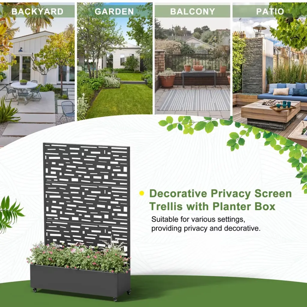This innovative Trellis with Planter Box not only provides an excellent space for growing plants or vegetables, but its screen panels also add decorative elegance and support for climbing vines. It is made from durable galvanized metal, ensuring it can withstand harsh temperatures without cracking. Additionally, it offers a practical solution for hiding outdoor equipment like air conditioners.