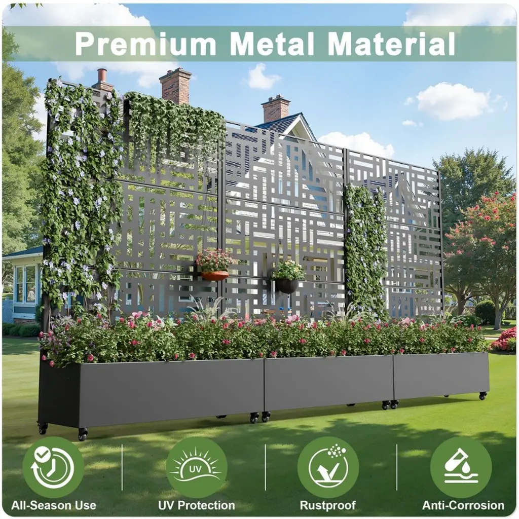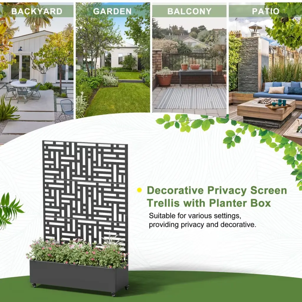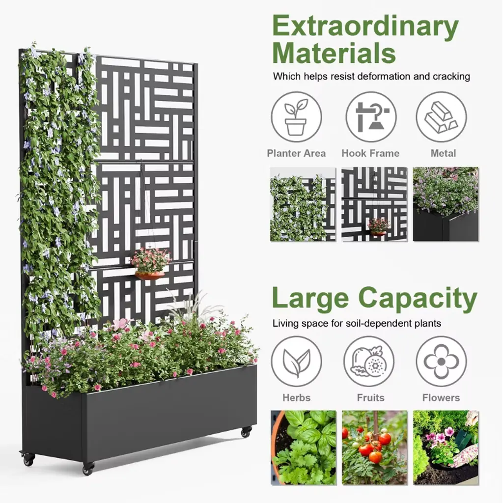 This innovative Trellis with Planter Box not only provides an excellent space for growing plants or vegetables, but its screen panels also add decorative elegance and support for climbing vines. It is made from durable galvanized metal, ensuring it can withstand harsh temperatures without cracking. Additionally, it offers a practical solution for hiding outdoor equipment like air conditioners.