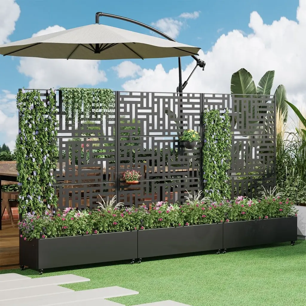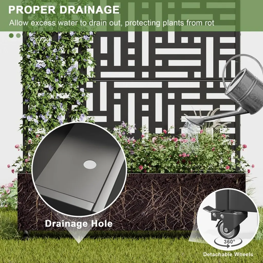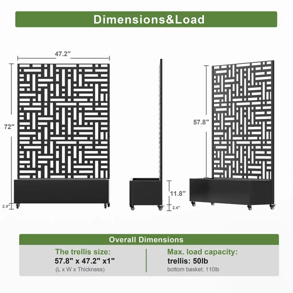 This innovative Trellis with Planter Box not only provides an excellent space for growing plants or vegetables, but its screen panels also add decorative elegance and support for climbing vines. It is made from durable galvanized metal, ensuring it can withstand harsh temperatures without cracking. Additionally, it offers a practical solution for hiding outdoor equipment like air conditioners.