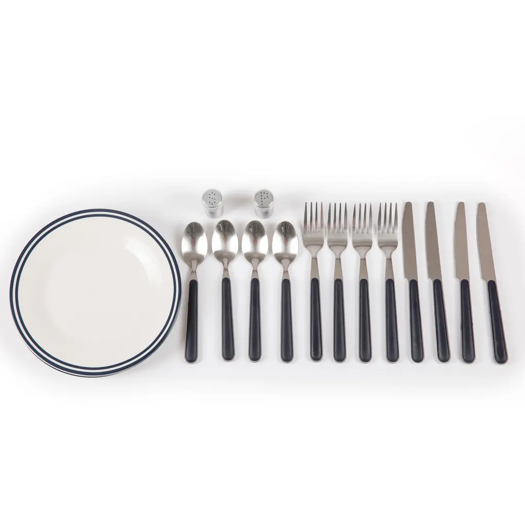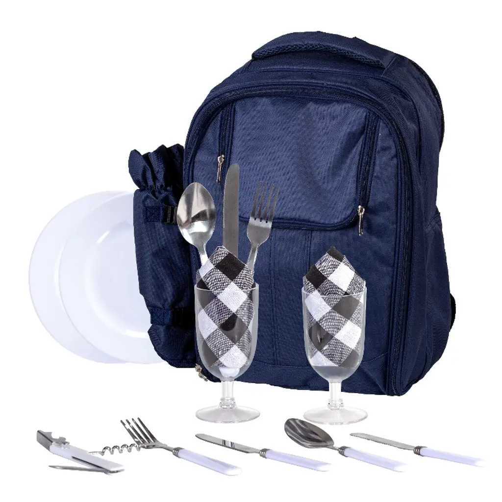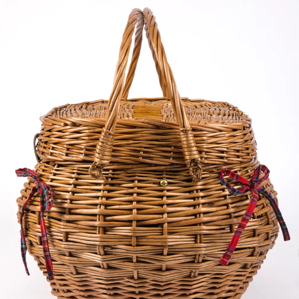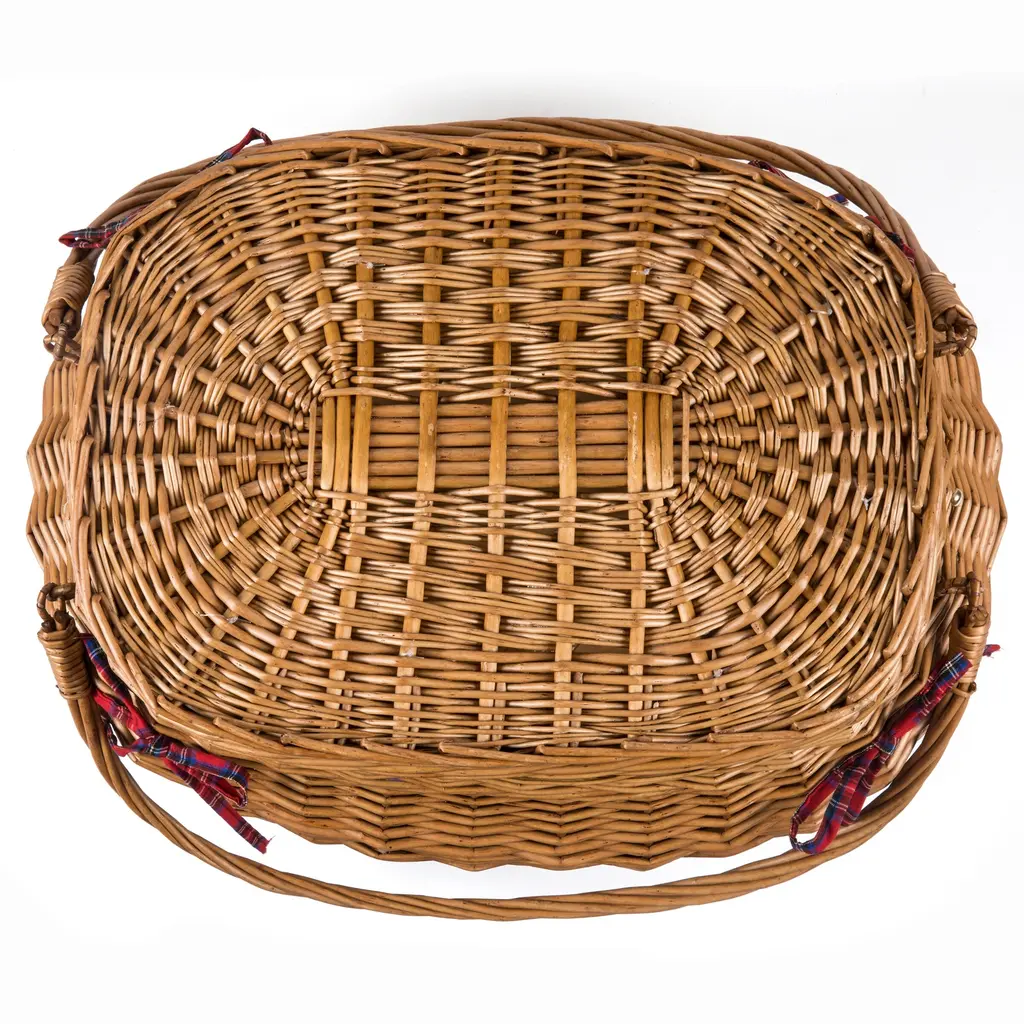 Take a long outdoor lunch with this elegant Highlander picnic basket set. The set includes a complete service for four with plates, silverware, and even hand-blown wineglasses. This set also includes a cheese knife, a cutting board, salt and pepper shakers, a waiter-style corkscrew, and a cozy red tartan picnic blanket, providing everything you need except for the food. Willow wicker basket28-piece setService for 4 peopleDouble handlesRed tartan liningPockets under lid for silverware, glasses, and more Dimensions: 21.5 inches long x 17.5 inches wide x 12 inches high4 porcelain plates (8-inch size with navy rings design) 4 hand-blown wine glasses (8 ounces) 4 (18/0) stainless steel forks, 4 knives, and 4 spoons 1 stainless steel cheese knife with wooden handle 1 stainless steel waiter-style corkscrew 1 plastic food storage container 1 set of frosted-glass salt and pepper shakers 1 insulated red polyester wine duffel 1 hardwood cutting board (6 inches x 6 inches) 1 picnic blanket with quilted red tartan cotton topside and navy polyester underside (60 inches long x 50 inches wide)