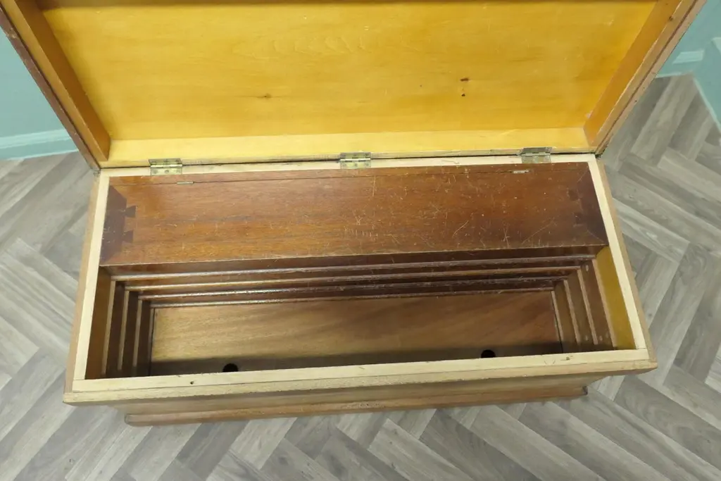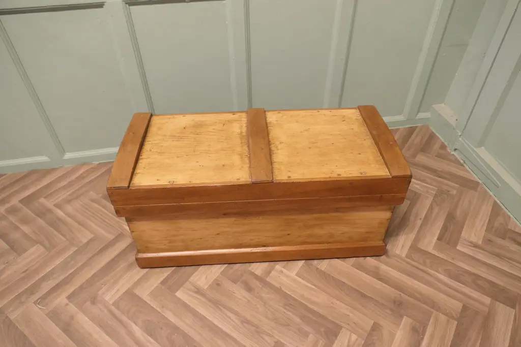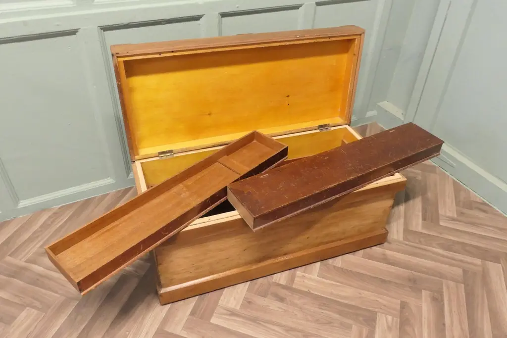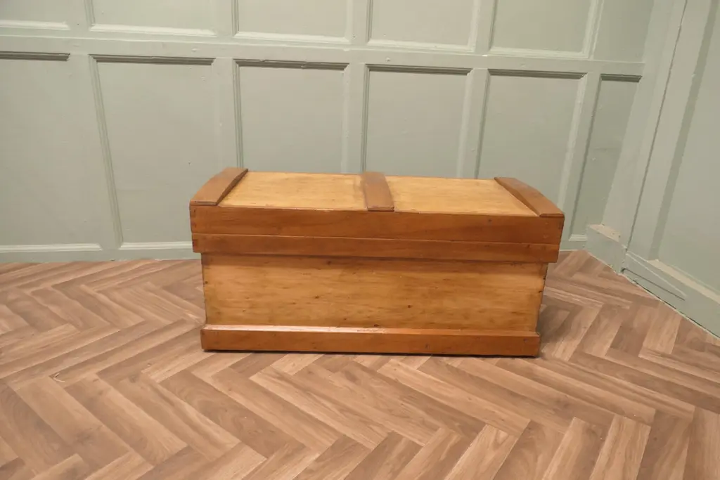 Pine Carpenters Tool Chest Apprentice PieceThis is a strong good quality pine box it stands on a small plinth inside there are full length drawers, This is a sturdy well made box it has ample storage, it is reinforced and it is in good sound condition.The box measures 34’’ wide x 15’’ deep and stands 16’’ highTAW111