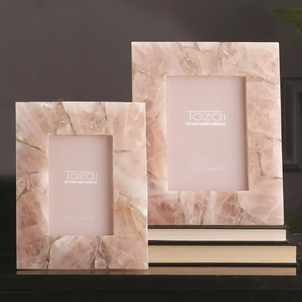 These heavy stone quartz frames are right on trend and the sides show the thickness and beauty of the quartz. Pink is the perfect color to make other hues pop, and add a bit of rosy warmth in the process. As with natural stones, each piece will have variances in color and pattern; no two will be exactly alike.