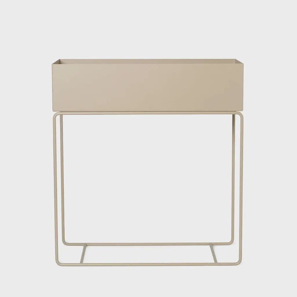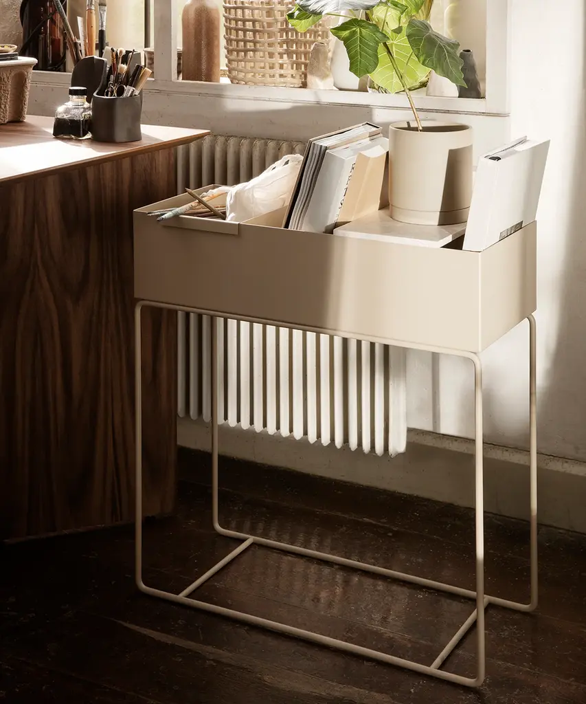 Our plant boxes can be used for decoration all over the house, as temporary storage in the hallway, or as a divider to create cozy corners in larger rooms. They’re suitable for flowers, plants, books, toys, and magazines – or maybe a little of each. Style them with delicate flowers in fine vases or try green plants in chunky clay pots and watch how the contrasts between the design and the added elements play. There’s an elegant and timeless aesthetic to the plant boxes from Ferm LIVING. The design has a striking and interesting contrast between the rectangular box on top and the thin metal legs. Plant boxes are available in several colors. Designed and produced by the Copenhagen-based studio Ferm Living.
