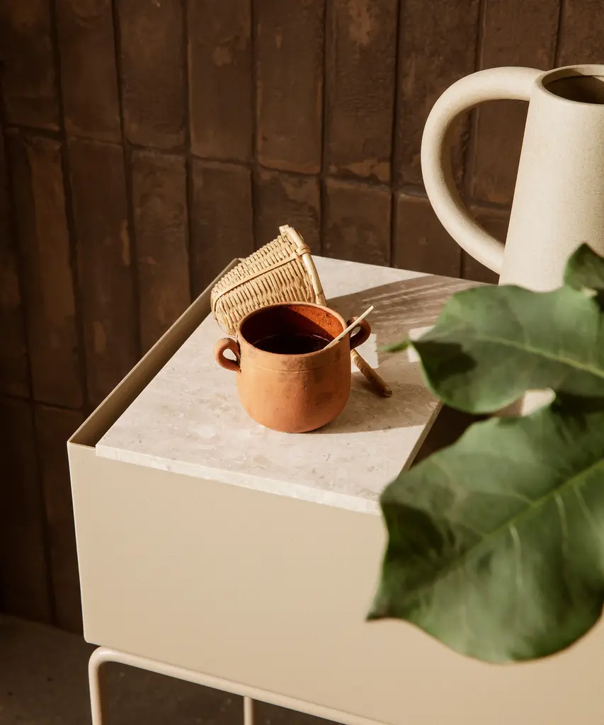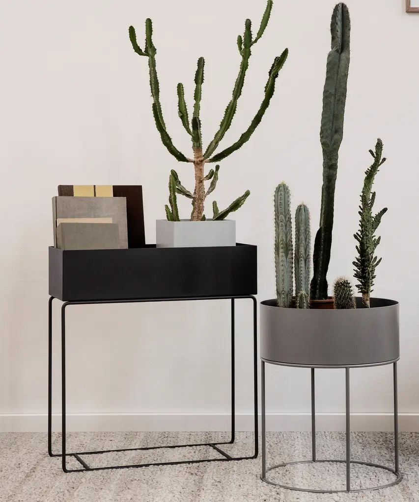 Our plant boxes can be used for decoration all over the house, as temporary storage in the hallway, or as a divider to create cozy corners in larger rooms. They’re suitable for flowers, plants, books, toys, and magazines – or maybe a little of each. Style them with delicate flowers in fine vases or try green plants in chunky clay pots and watch how the contrasts between the design and the added elements play. There’s an elegant and timeless aesthetic to the plant boxes from Ferm LIVING. The design has a striking and interesting contrast between the rectangular box on top and the thin metal legs. Plant boxes are available in several colors. Designed and produced by the Copenhagen-based studio Ferm Living.