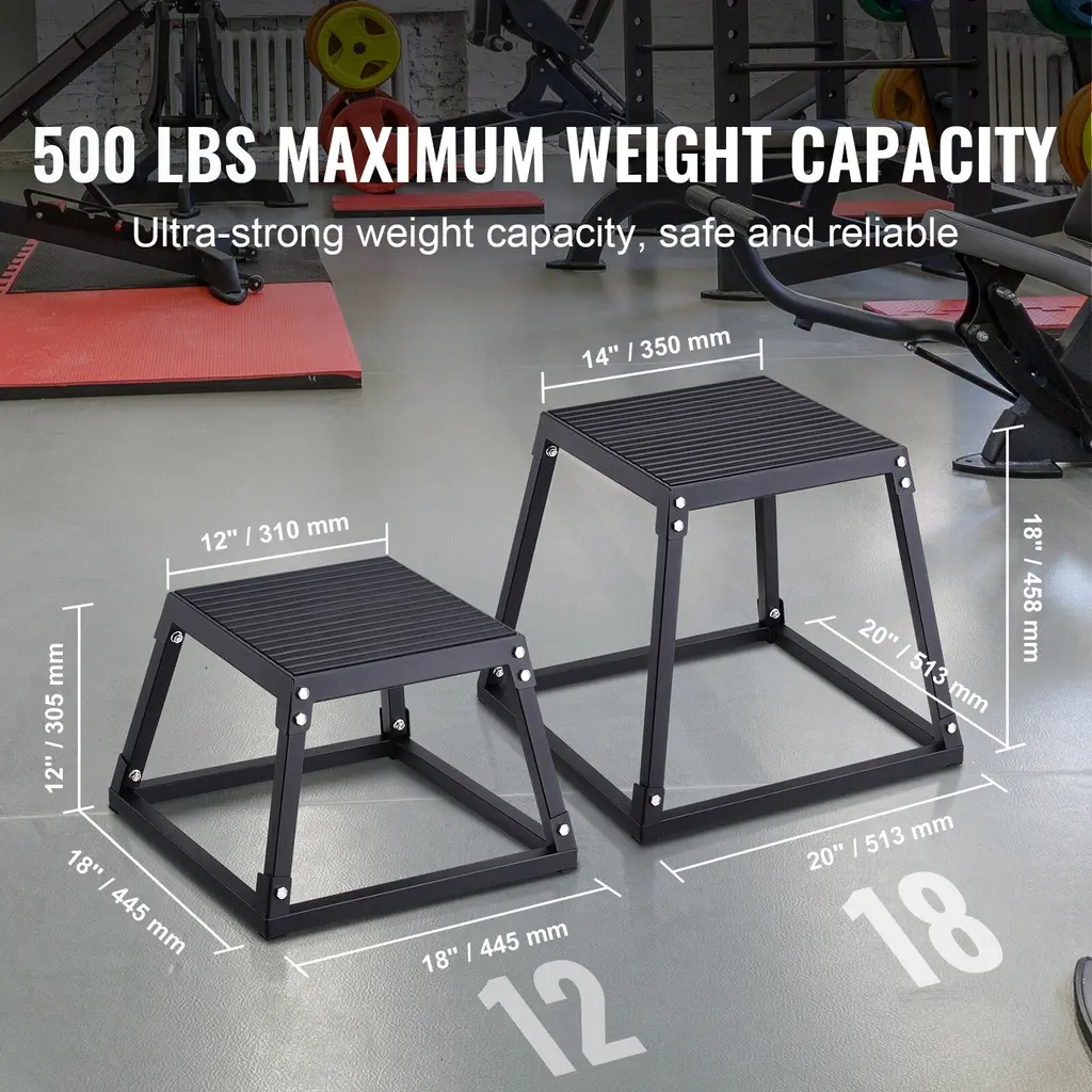 Multiple Sizes to Choose From: Our product series is very wide, so you can freely select different sizes for your training. This plyometric boxes is suitable for individuals of all levels, from beginners to professionals, and is also ideal for home gym setups. For 4-Piece Set option: You have the freedom to select from different sizes, including 12 inches, 18 inches, 24 inches, and 30 inches, for versatile full-body workouts. For 3-Piece Set option: You have the flexibility to choose from various sizes, including 12 inches, 18 inches, and 24 inches, for versatile full-body workouts. Durable and Stable: This plyometric platform box features a trapezoidal workout design, ensuring a sturdy structure. The welded parts are solid and durable, maintaining stability even during high-intensity workouts. With a super-strong 500-pound weight capacity, it caters to a variety of training needs. The steel tubing surface is coated with a powder finish, providing both aesthetics and corrosion resistance, creating a stable environment for jump training. Anti-Slip Design: The plyobox for home & gym training is equipped with four rubber pads at the bottom and a textured silicone surface on top. This design offers stability and grip, ensuring safe and effective workouts. Multi-Functional Enhanced Platform: A versatile fitness exercise jump box that allows for box jumps, step-ups, push-ups, squats, and more. It's also suitable for personalized training to improve shoulders, arms, chest, buttocks, legs, and enhance overall core stability. Easy to Install: Our plyo box is straightforward to assemble; simply tighten the components following the instructions. When not in use, the boxes can be stacked or disassembled for convenient storage and portability. Package Content 1 x Plyometric Platform Box / 4 x Plyometric Platform Boxes / 3 x Plyometric Platform Boxes 1 x Set of Installation Accessories