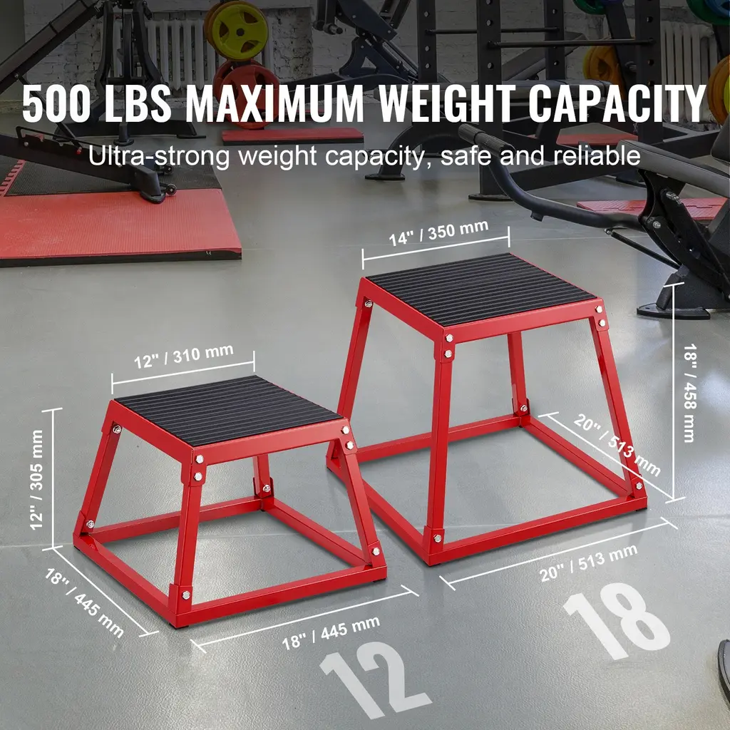Multiple Sizes to Choose From: Our product series is very wide, so you can freely select different sizes for your training. This plyometric boxes is suitable for individuals of all levels, from beginners to professionals, and is also ideal for home gym setups. For 4-Piece Set option: You have the freedom to select from different sizes, including 12 inches, 18 inches, 24 inches, and 30 inches, for versatile full-body workouts. For 3-Piece Set option: You have the flexibility to choose from various sizes, including 12 inches, 18 inches, and 24 inches, for versatile full-body workouts. Durable and Stable: This plyometric platform box features a trapezoidal workout design, ensuring a sturdy structure. The welded parts are solid and durable, maintaining stability even during high-intensity workouts. With a super-strong 500-pound weight capacity, it caters to a variety of training needs. The steel tubing surface is coated with a powder finish, providing both aesthetics and corrosion resistance, creating a stable environment for jump training. Anti-Slip Design: The plyobox for home & gym training is equipped with four rubber pads at the bottom and a textured silicone surface on top. This design offers stability and grip, ensuring safe and effective workouts. Multi-Functional Enhanced Platform: A versatile fitness exercise jump box that allows for box jumps, step-ups, push-ups, squats, and more. It's also suitable for personalized training to improve shoulders, arms, chest, buttocks, legs, and enhance overall core stability. Easy to Install: Our plyo box is straightforward to assemble; simply tighten the components following the instructions. When not in use, the boxes can be stacked or disassembled for convenient storage and portability. Package Content 1 x Plyometric Platform Box / 4 x Plyometric Platform Boxes / 3 x Plyometric Platform Boxes 1 x Set of Installation Accessories