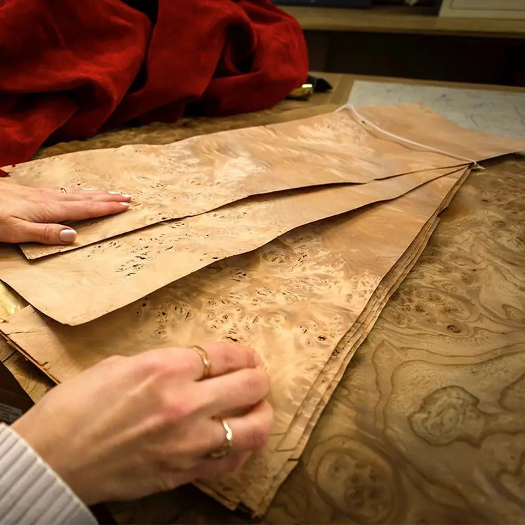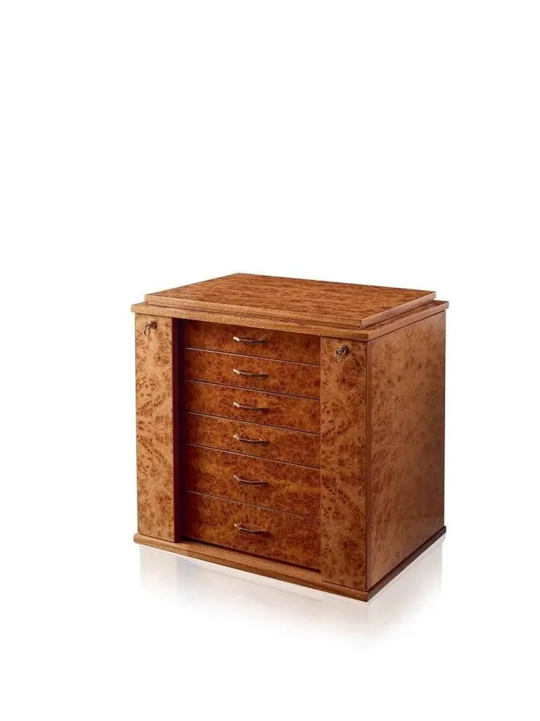 Jewelry chest in polished briarwood and mahogany, ultrasuede lining, 24-karat gold plated brass accessories. With necklace bars, lockable doors and five drawers. Adjustable mirror on the top section.
