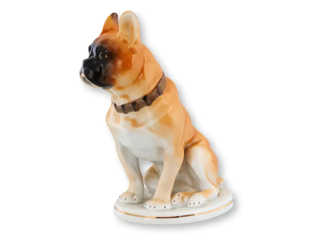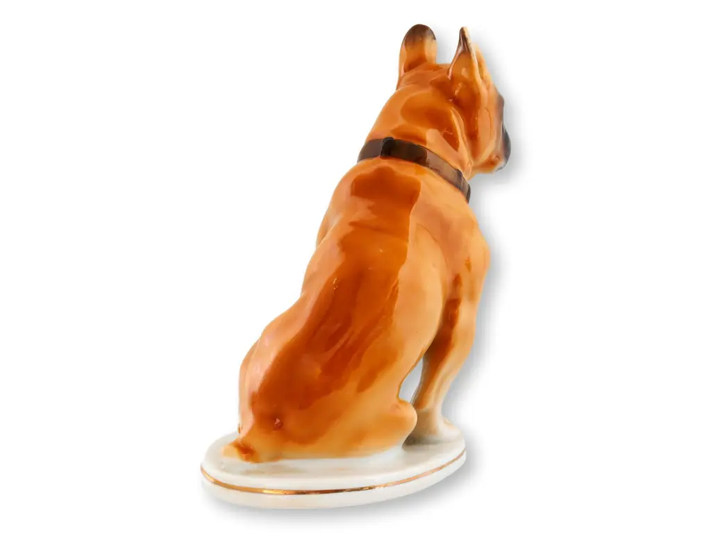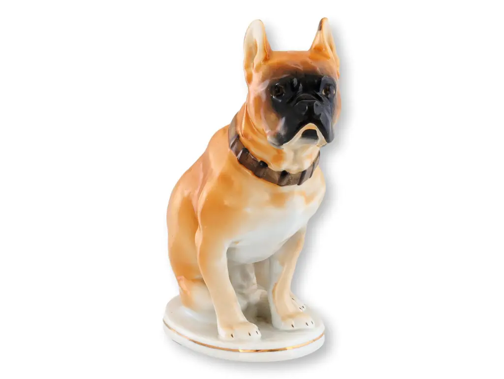 Embrace the loyalty and charm of the boxer breed with this porcelain figure. Crafted with meticulous attention to detail, it captures the essence of this beloved canine companion. Whether displayed on a shelf, desk, or as a decorative accent, this porcelain boxer figure adds a touch of canine elegance and affection to your living space. No maker's mark.