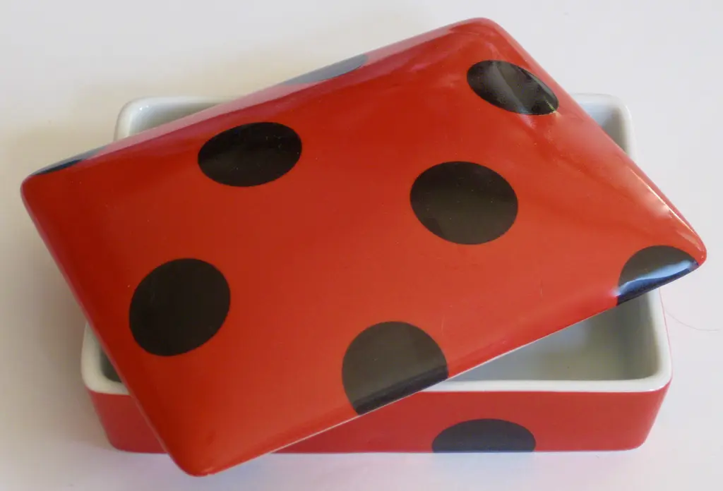 Exuberant lipstick red porcelain box covered in jet black polka dots. Marked "Fitz and Floyd Japan."