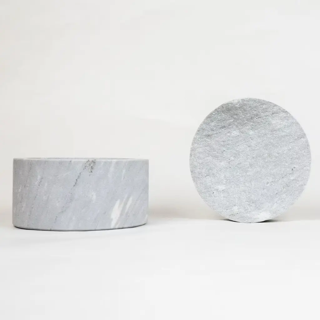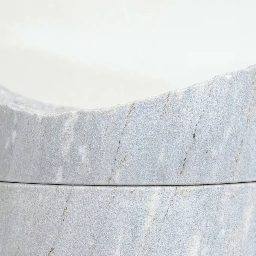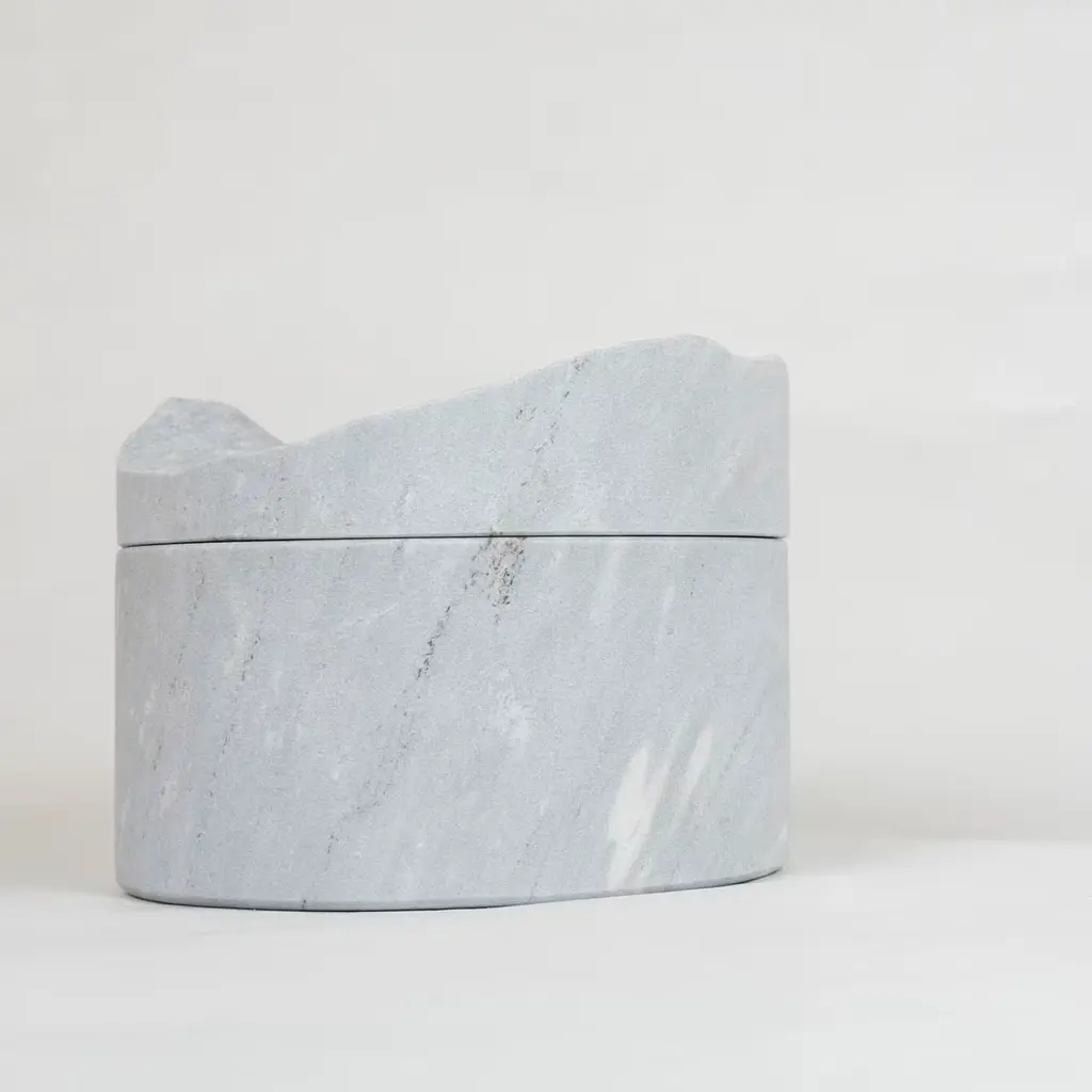 This precious unique piece of little box presents two cylindrical extractions from the same stone forming a cloud-like lid and a body. They fit together imperfectly, finding each other, and reconstructing a geological unit of which they are part. The empty space inside is perfect for guarding a dream. Palissandro marble bluette. Pietre Trovanti creations are like snowflakes: they can be traced back to the same source but they are always different. Palissandro marble classico. Created in Ossola Valley, Piedmont. Italy.