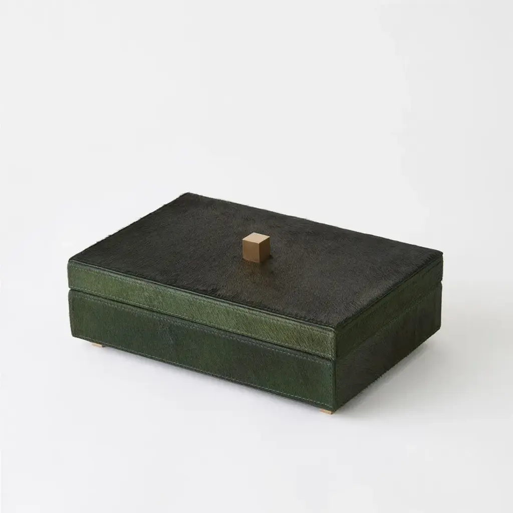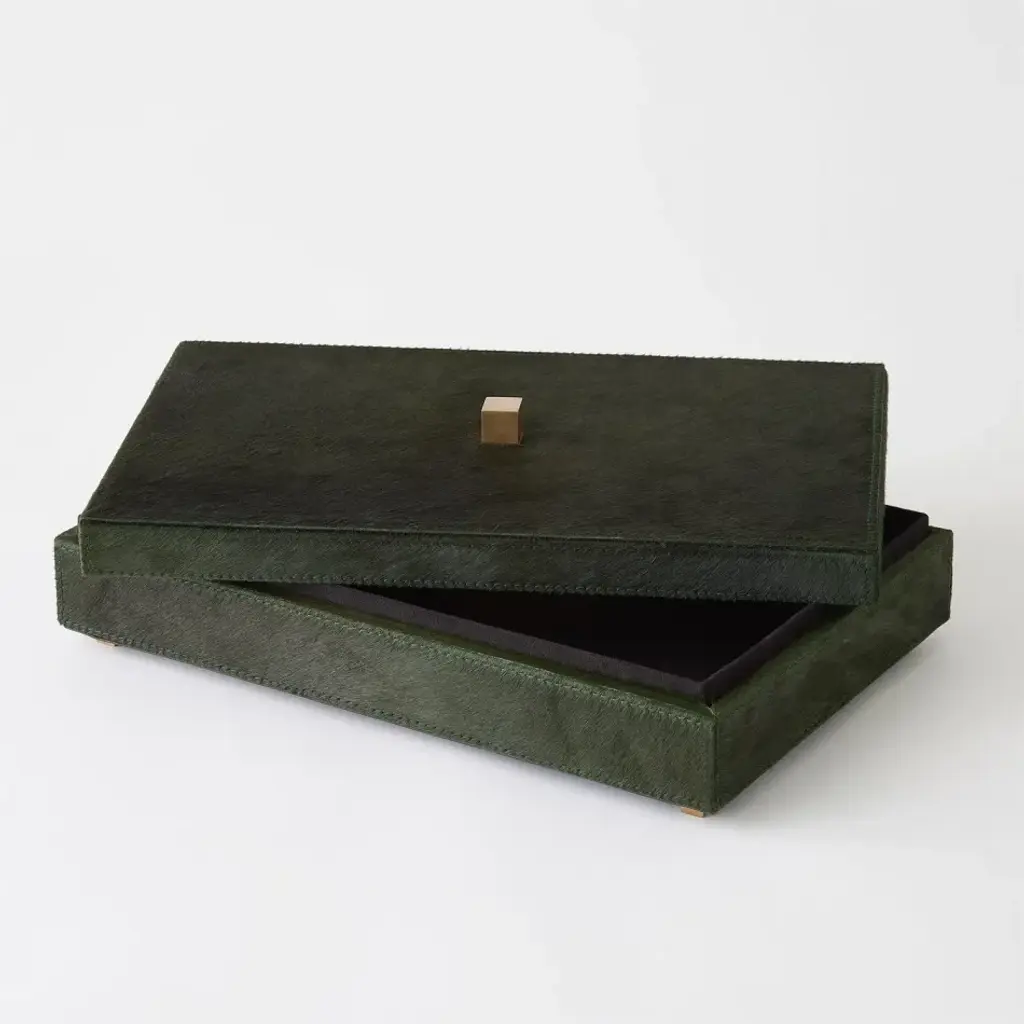 The Posh Boxes are luxuriously wrapped in green hair-on-hide leather blending practicality with sophistication in your living space. The collection features antiqued brass-finished handles and microsuede in the interiors of the boxes. From a fashion forward perspective, Global Views offers accessories, furniture, statement lighting, and an assortment of rugs and mirrors to add beauty and joy to your home.