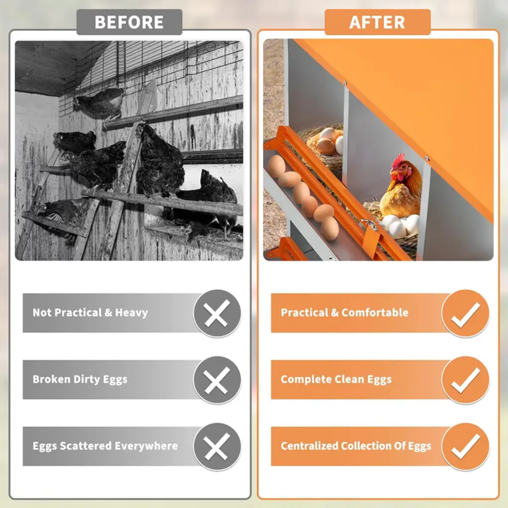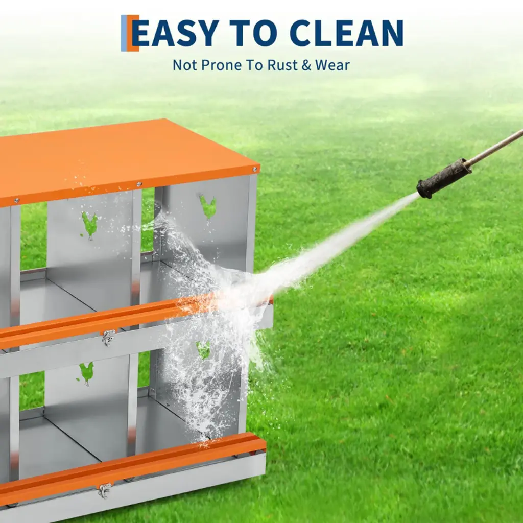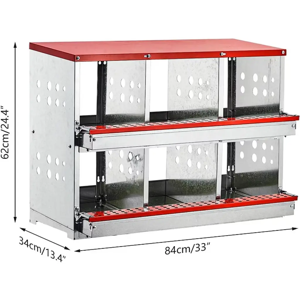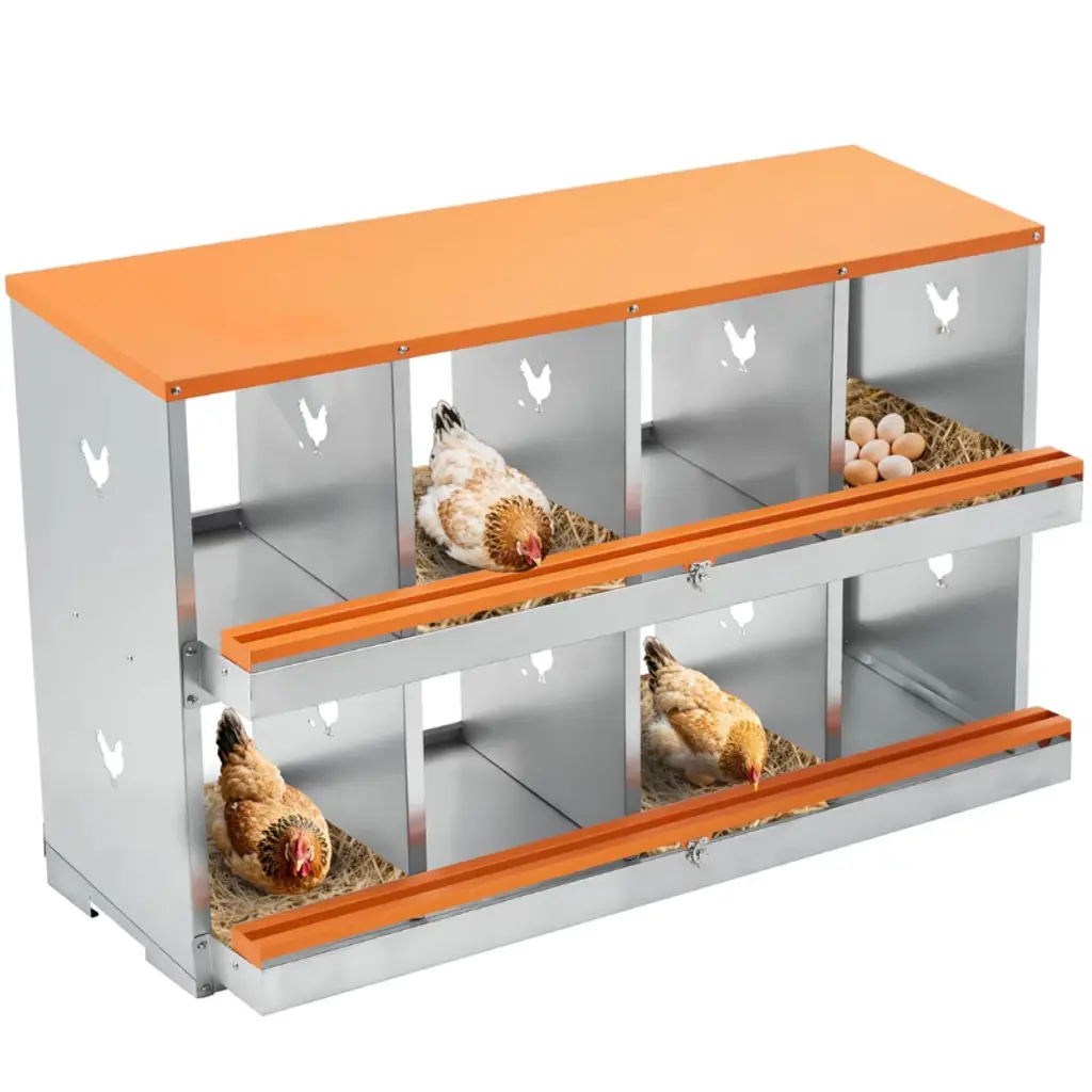 Poultry Nesting Box with Automatic Egg Collection ¨C 6 or 8 Compartment Outdoor Hen Laying Box, Galvanized Steel and Waterproof Key Features:Automatic Egg Collection SystemDesigned with a gently slanted floor that allows eggs to roll smoothly into a protected collection area under a secure lid. This helps keep eggs clean, intact, and safely stored until gathering. Adding soft padding in the collection area is recommended for extra protection.Spacious and Ventilated CompartmentsOffers 6 or 8 roomy nesting spaces that allow hens to stand and move comfortably. Features vented side panels to improve airflow, keeping the interior dry, cool, and comfortable for happier, more productive laying hens.Durable and Weather-Resistant Galvanized SteelBuilt with strong, rust-resistant galvanized steel, this nesting box withstands outdoor conditions season after season. Its waterproof and lightweight design ensures long-lasting use without wear or corrosion.Easy Cleaning and Low MaintenanceSmooth, waterproof surfaces can be rinsed quickly using a garden hose. The simple design allows for effortless cleaning, helping maintain a hygienic laying environment that promotes hen health and egg production.Quick and Tool-Free AssemblyIncludes all required screws, nuts, and clear instructions for straightforward setup. Pre-aligned holes and intuitive parts make assembly hassle-free¡ªno special tools needed.Product Details:Product Dimensions: 31.89"L x 13.39"W x 26.38"HSpecific Uses: OutdoorSpecial Feature: WaterproofMaterial: Galvanized SteelOptions: 6 or 8 CompartmentsIncluded Components: Nesting Box
