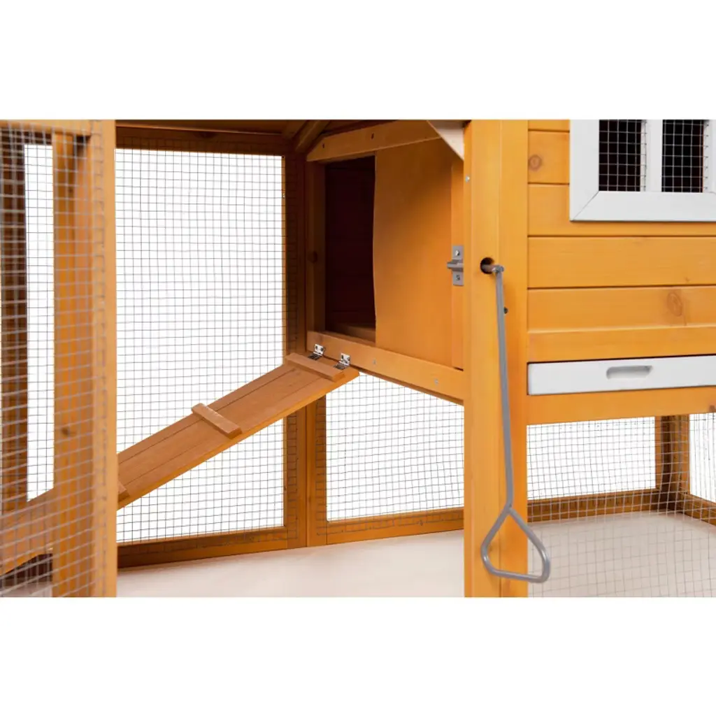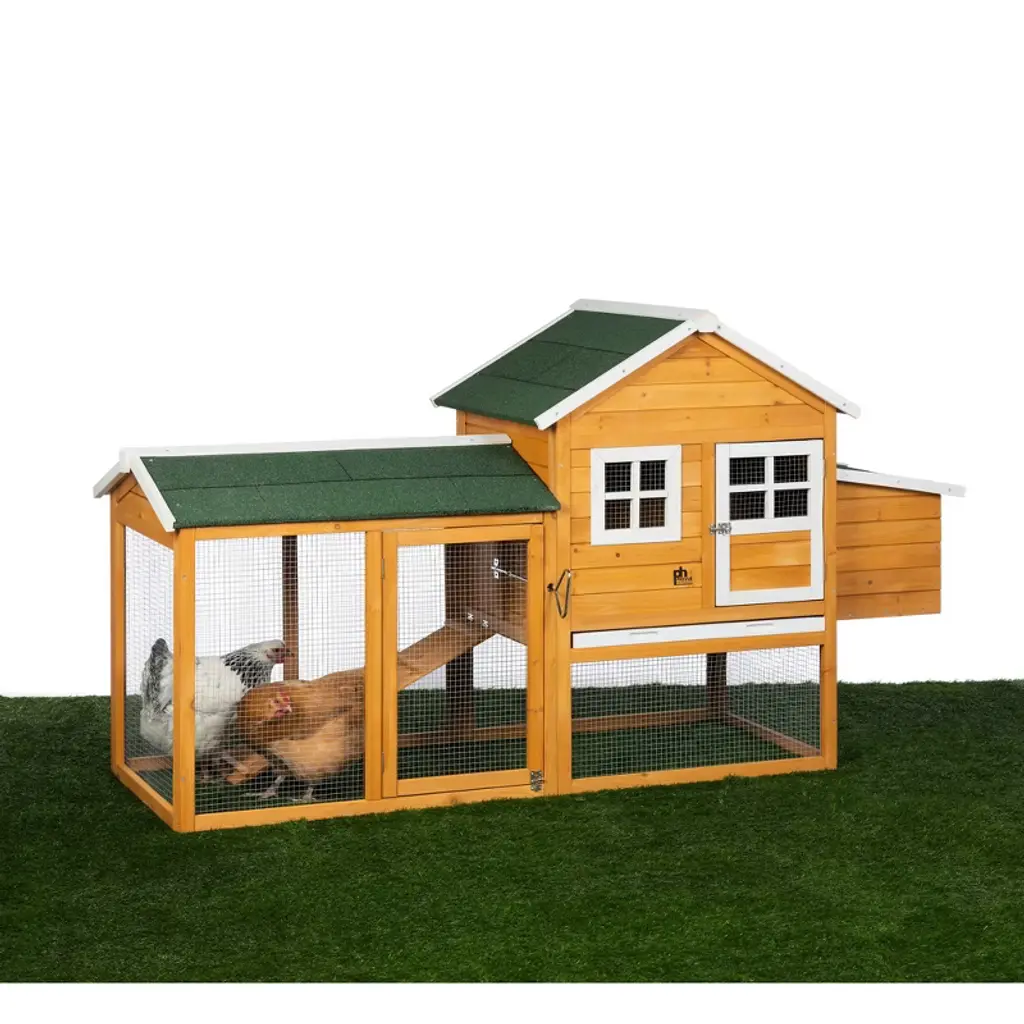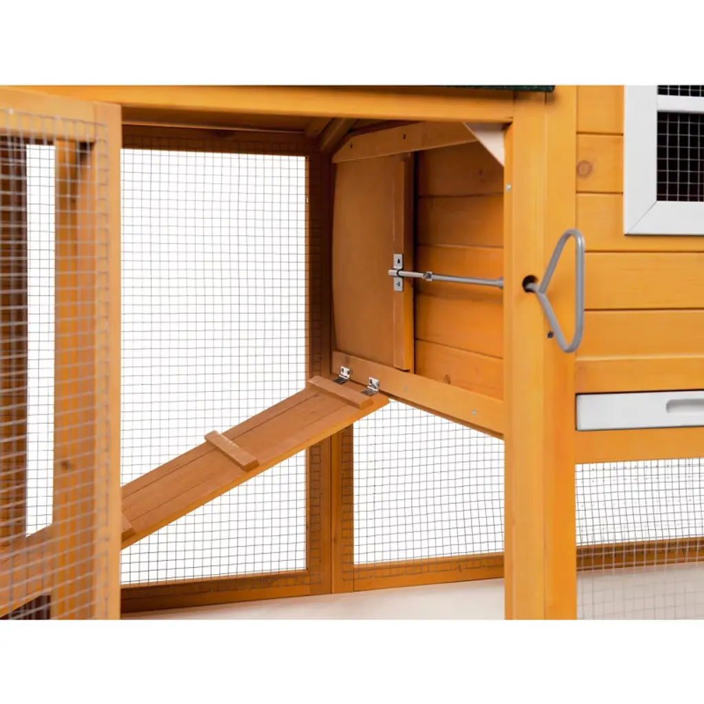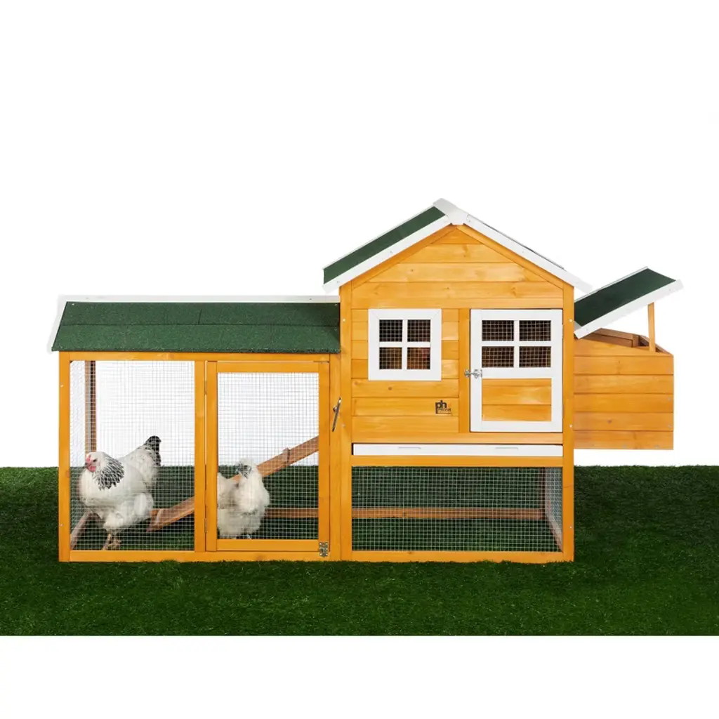 This adorable coop is compact yet roomy. The elevated coop allows hens full use of the enclosed chicken run. The coop interior features a removeable floor tray for routine cleaning, two roosting bars, and full access to the 2-bay nest box. An interior coop divider door can be closed from the exterior with a jointed handle. Two access doors with barrel bolt locks and a lock-ready nest box lid allow access to all areas