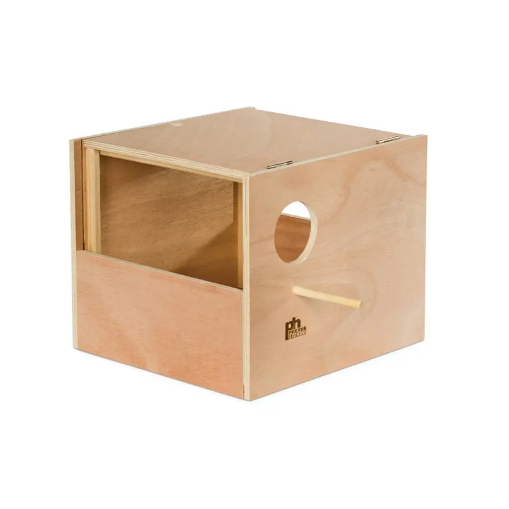 Prevue Pet Products Cockatiel Nest Box 1106 is solid hardwood with an indented center bottom features two slide up side panels for easy access and cleaning. Box measures 12 1/4" long, 11 1/2" wide and 9 7/8" High.