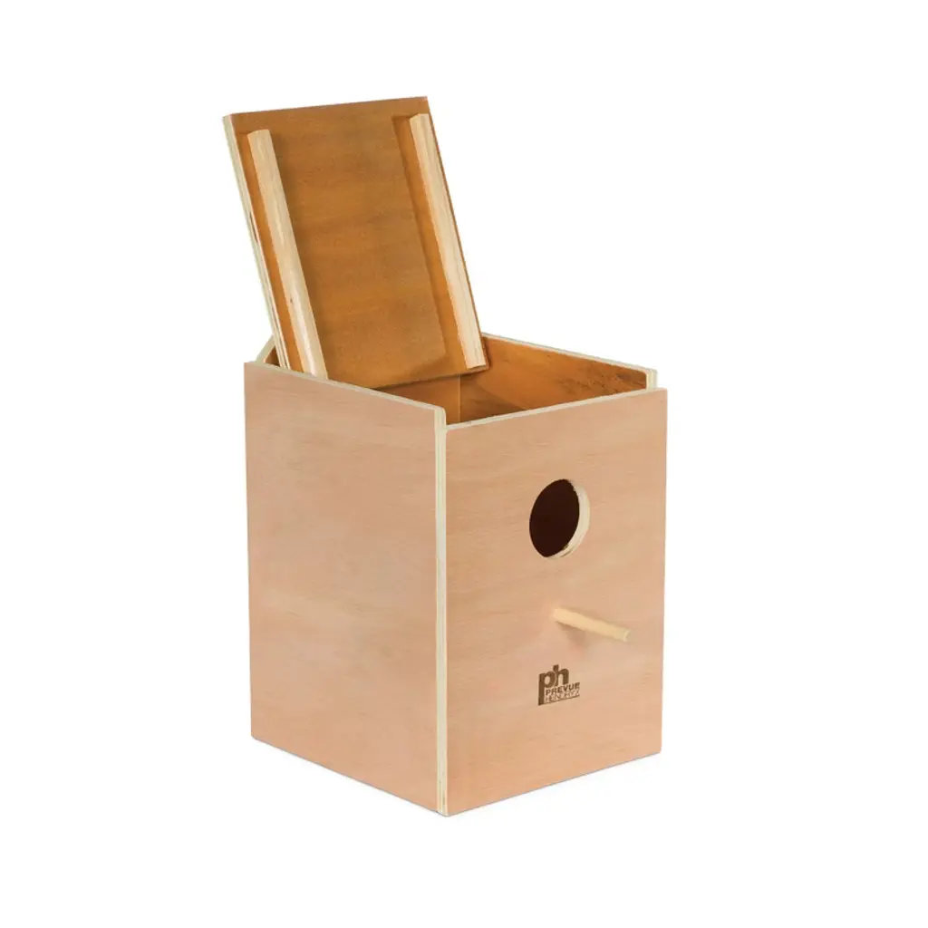 Prevue Pet Products Parakeet Nest Box 1103 is solid hardwood with an indented bottom center to prevent egg rolling. Top opening for easy cleaning and removal of bedding materials. Box measures 7" long, 7 1/8" wide, and 8 1/2" high.