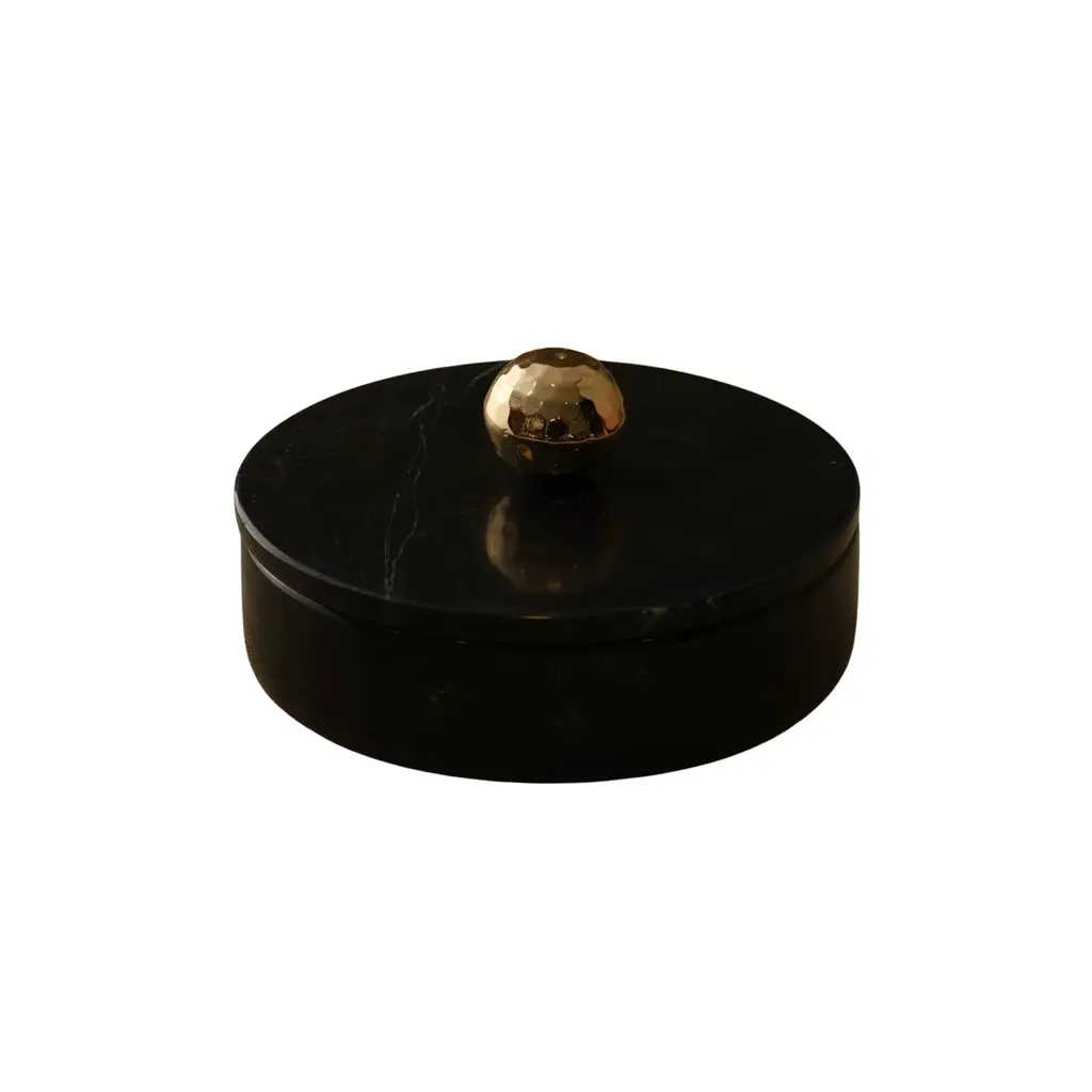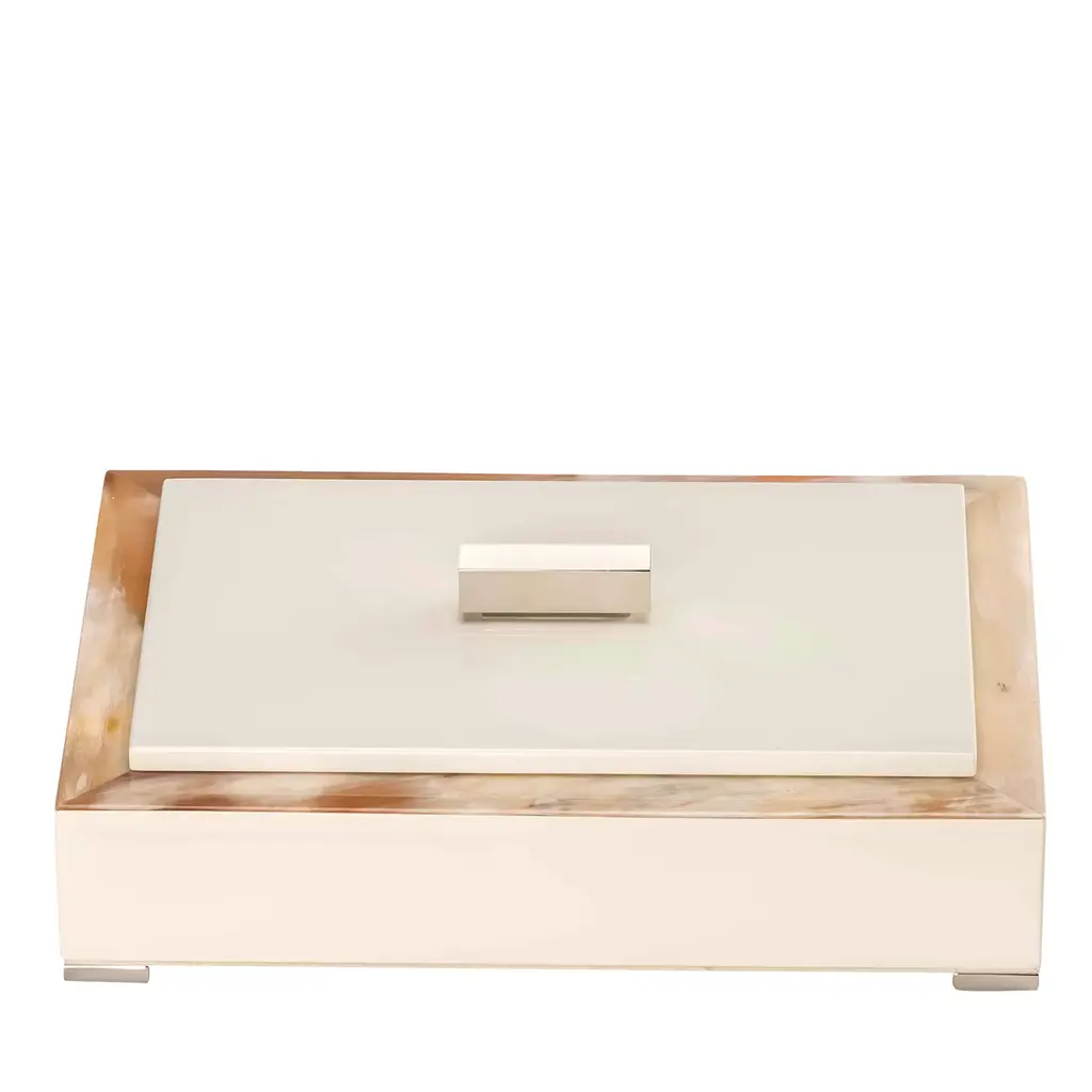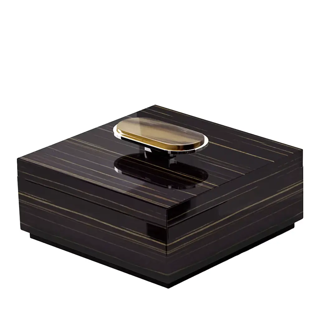 Sophisticated addition to a dresser or vanity, this box makes for a superb solution where to store jewel favorites. A glossy black finish of unfailing elegance marks the entire wooden structure and its coordinated lid, only interrupted by the chromed brass handle and its prized horn insert. A luminous ivory version Is available in the Artemest catalog.