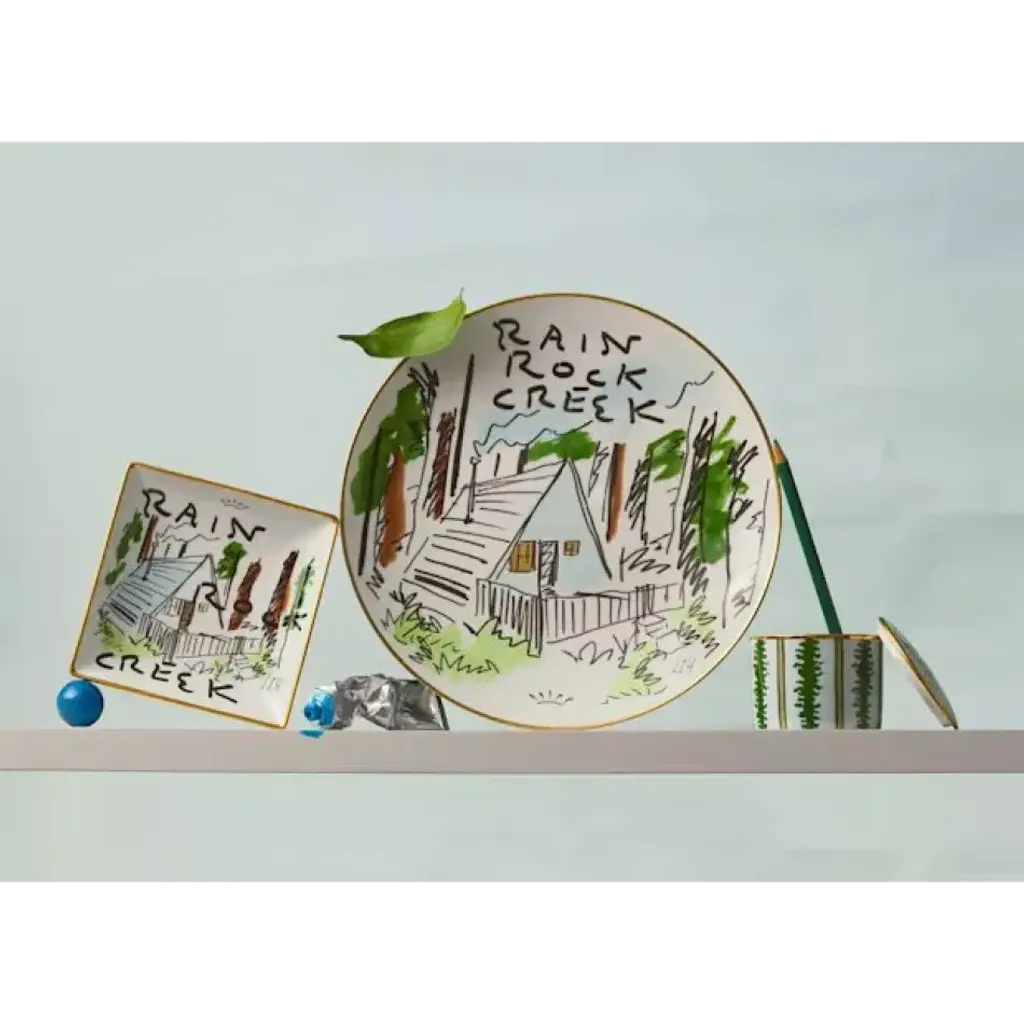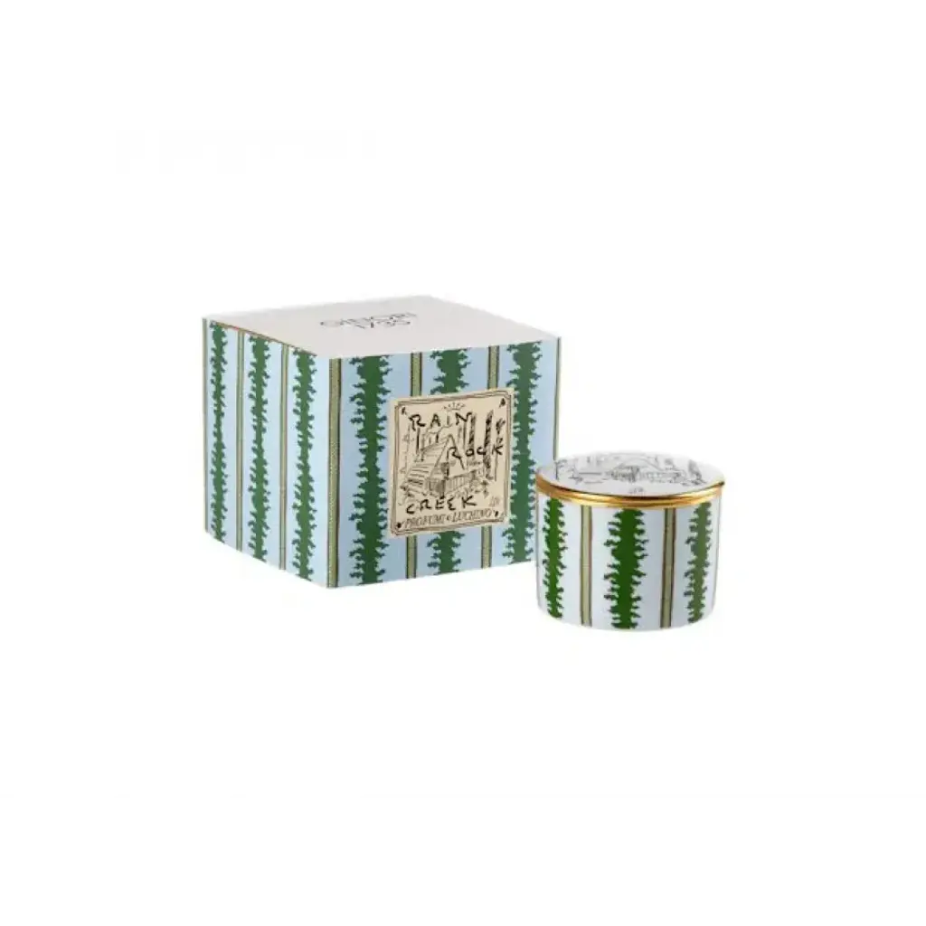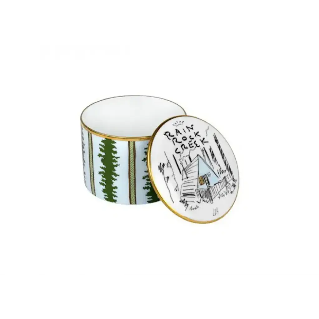 Pure porcelain box ( 3,14 in ) with lid. It is dawn. A ray of sunlight filters into the wooden bungalow, and lengthens on the floor. In the vast canyon outside, the dry leaves are scrunched underfoot. And in the distance, through the trees, you can just hear the crashing of the waves at the water’s edge – the deep blue of the Pacific. The picture, created by designer Luke Edward Hall, depicts the Rain Rock Creek, a fantastic memory of a trip to the Big Sur, one of the artist's favourite places. The article is unscented, it follows the decorative world of the Rain Rock Creek fragrance, with a designer plate and a porcelain squared vide poche. It is available in the four other Fox Thicket Folly, La Gazelle d'Or, Rajathra Palace and Palazzo Centauro.