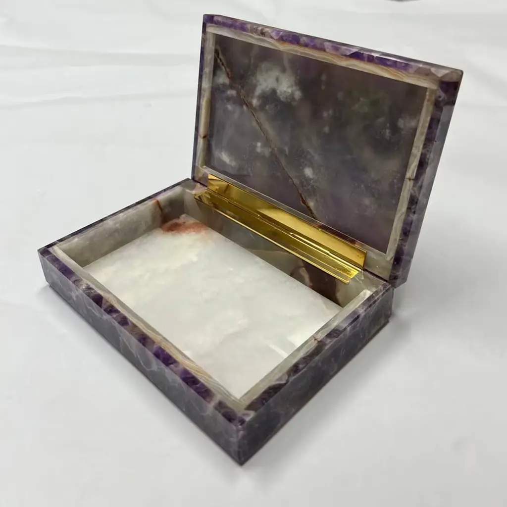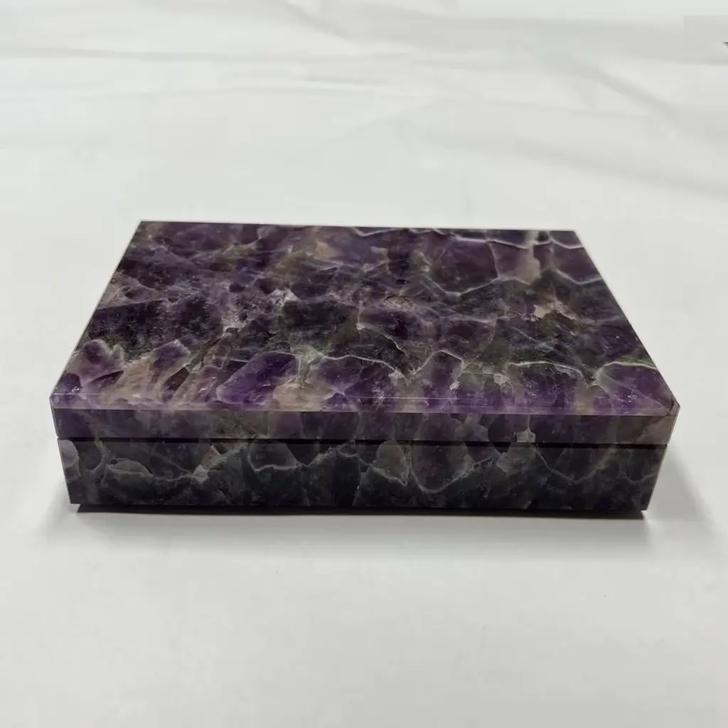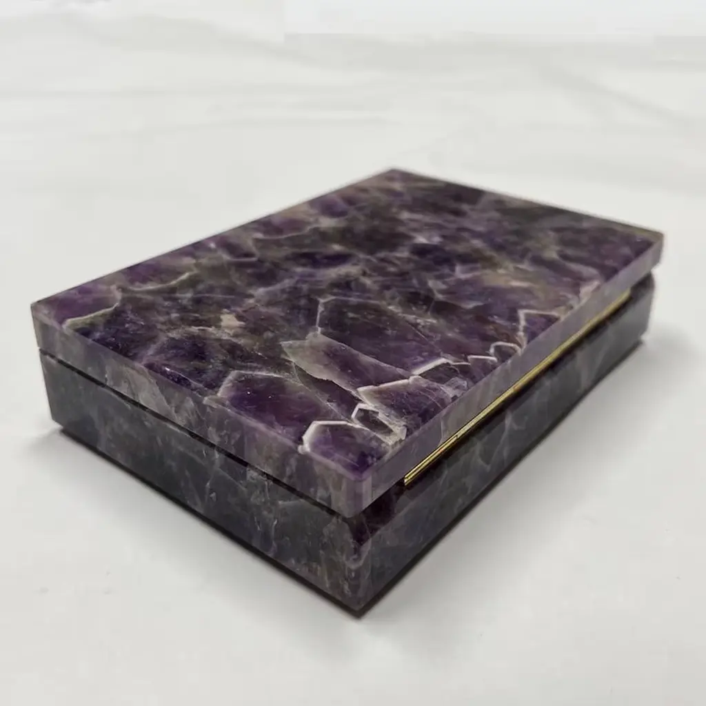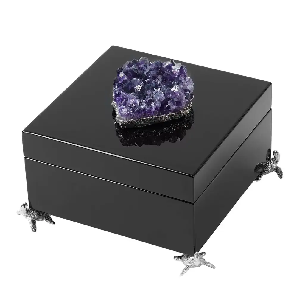 Jewelry favorites will find a luxurious home within this precious box in fine amethyst. Marked by clean lines, it captures the eye with the breathtaking paths traced by its white veins, surrounded by sensual purple tones combined with darker accents. Its name - Italian for protector - hints at the belief, dating back to ancient Egypt that it protected travelers.