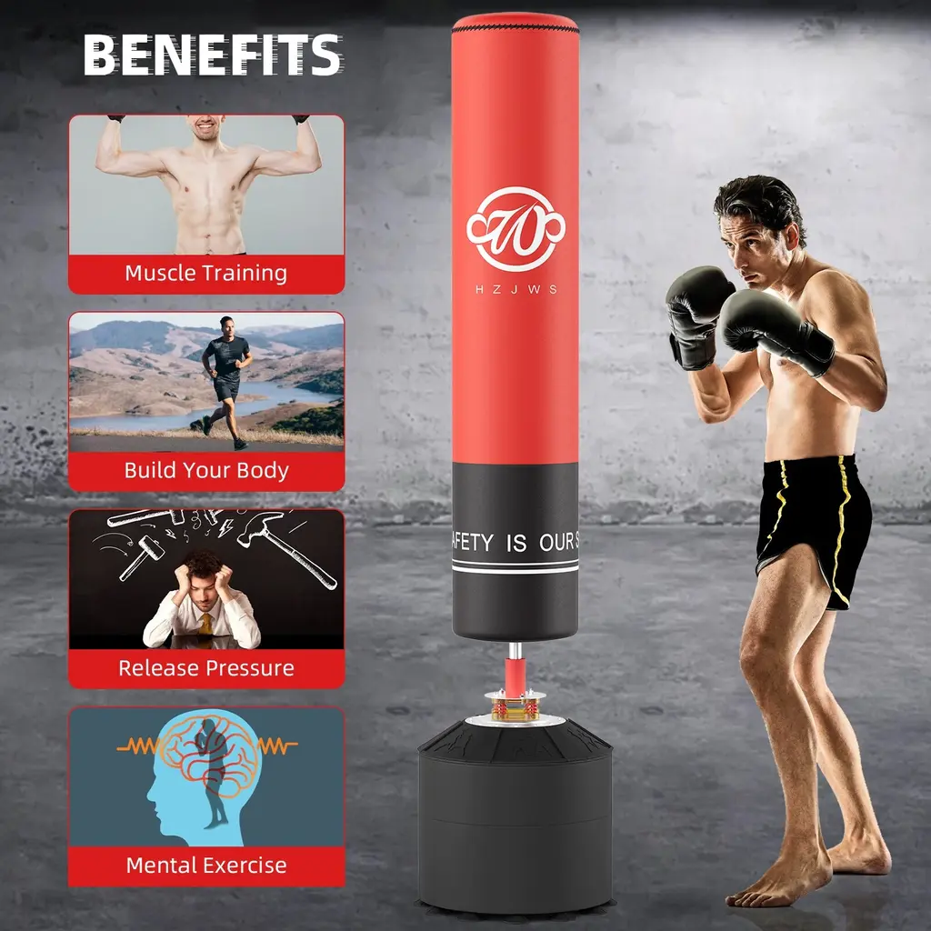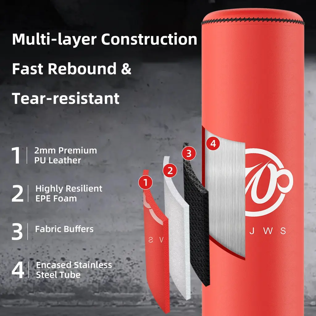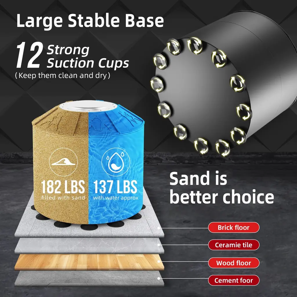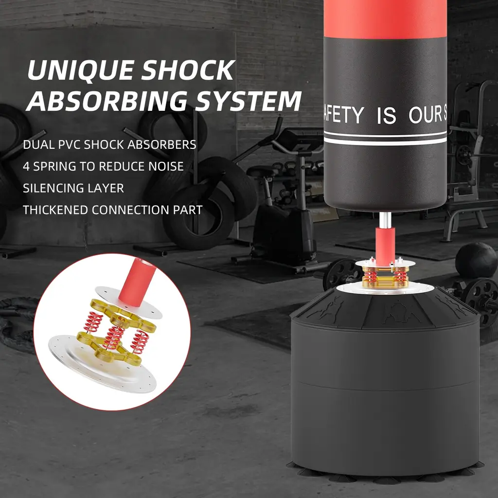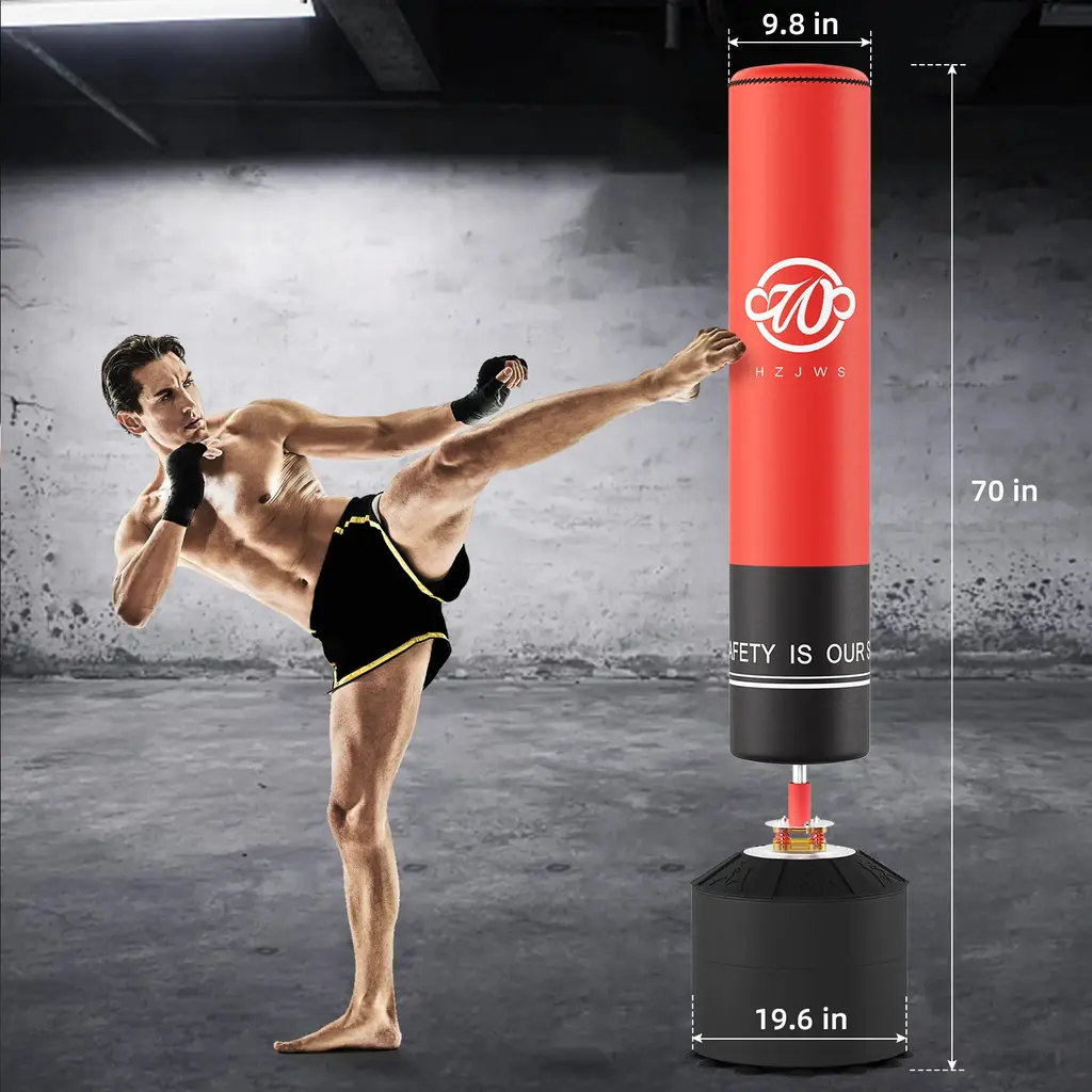 High-quality 4 Inner Materials: The boxing bag is made of high-resilience PU leather, highly resilient EPE foam, power buffer layer, and polyurethane liner. High resilience, tear resistance, and durability. While enjoying boxing, it can minimize sports injuries. Sewn with nylon thread, has great elasticity and can quickly return to its original shape, which is very beneficial for boxing training. Upgrade Freestanding Punching Bag: Stands approx 70'', suitable for adults, teens, and kids(47-73'' tall). Easy to assemble, save space, you can enjoy professional boxing, muay thai, kickboxing training at home. The red appearance can stimulate the mood of boxing training, making the punches more exciting and stress-relieving. Advanced Shock Absorption System: Equipped with 4 springs, dual PVC shock absorbers, and thickened connection part, while improving the shock absorption effect, it quickly disperses the rebound force and reduces the damage of the reaction force to the human body. Enlarged Base with Strong Suction Cups: 12 sets of large suction cups, can be attached to any smooth surface. The 12-foot high base weighs 182 lbs when filled with sand, ensuring you get maximum stability during your fitness. Easy to Assemble: The punching bag with stand can be assembled in 15 minutes, installation and disassembly are very simple, no drilling is required. Sent in 2 packages, if you have any questions, please contact us.