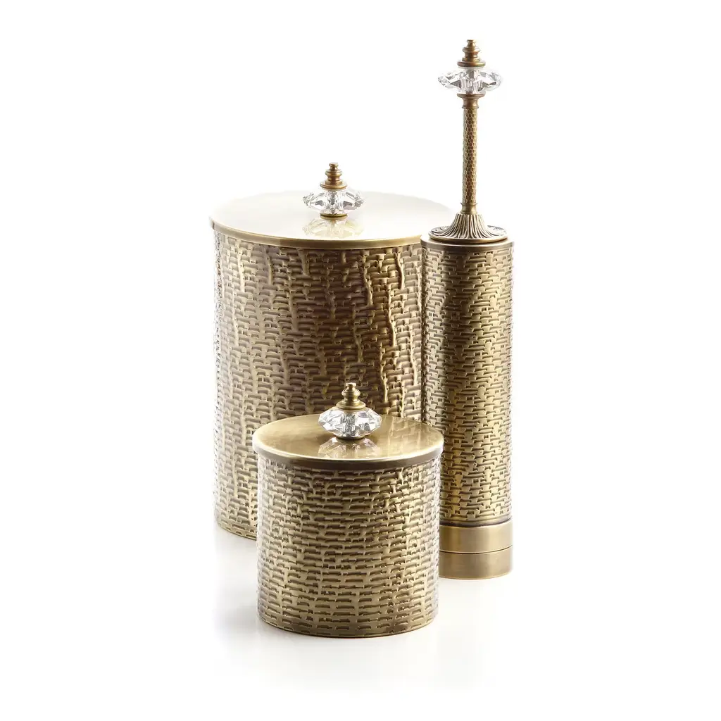 A superb jewelry box in burnished hammered brass with a Swarovski crystal element. A flawless work of high expertise, characterized by the Python texture that makes this composition elegant and dynamic. A must for anyone that wants to keep their high-value jewels in a high-value box. It is 20 cm tall and it has a diameter of 16 cm.