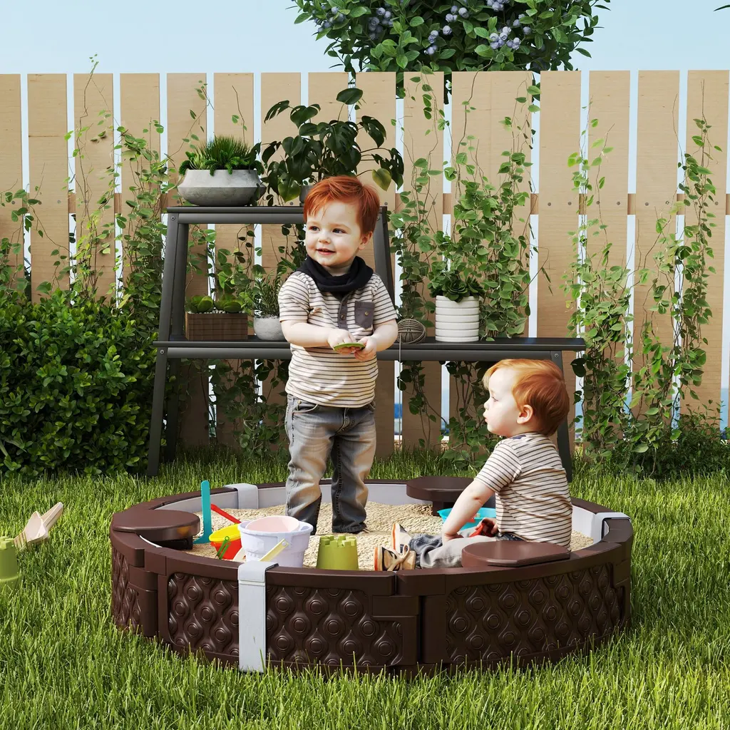 Descriptions:Transform your backyard into a playground with the Qaba kid's sandbox! This sandbox holds up to 661 lbs. of sand and accommodates three kids with built-in seats. Crafted from anti-UV, rainproof HDPE, it brings fun and is fade-resistant. Plus, it comes with a waterproof liner and weather-resistant cover to keep playtime fresh and exciting!Features:● Holds up to 661 lbs. of sand, Suitable for extensive play● Includes three seats, comfortably fits three children● Made with HDPE, keeping durability against UV and rain● Fade-resistant material maintains appearance over time● Waterproof liner at the bottom prevents outdoor debris and keeps drainage● Weather-resistant cover keeps sand dry during rainfall● Assembly is easy and quickSpecification:● Color: Dark Brown● Material: HDPE, Polyester● Overall Dimensions: 47.2" Dia. x 8.7" H● Inner Size: 43.3" Dia. x 8.7" H● Sand Load: 661 lbs.● Seat Size: 9.3" L x 8.7" W● Seat Height: 8.7" H (to floor)● Maximum Load: 66 lbs. (per seat), 198 lbs. (total)● Recommended Age: 18-60 months● Approved Age: 18+ months● Item Label: 343-075V00DR