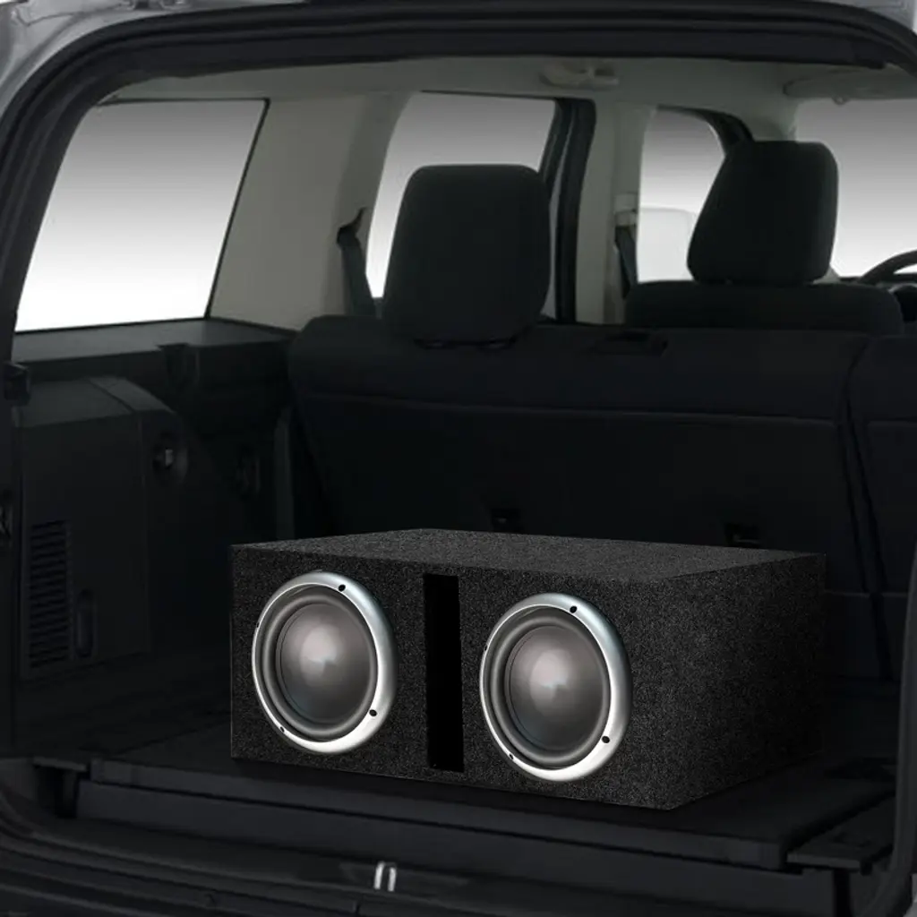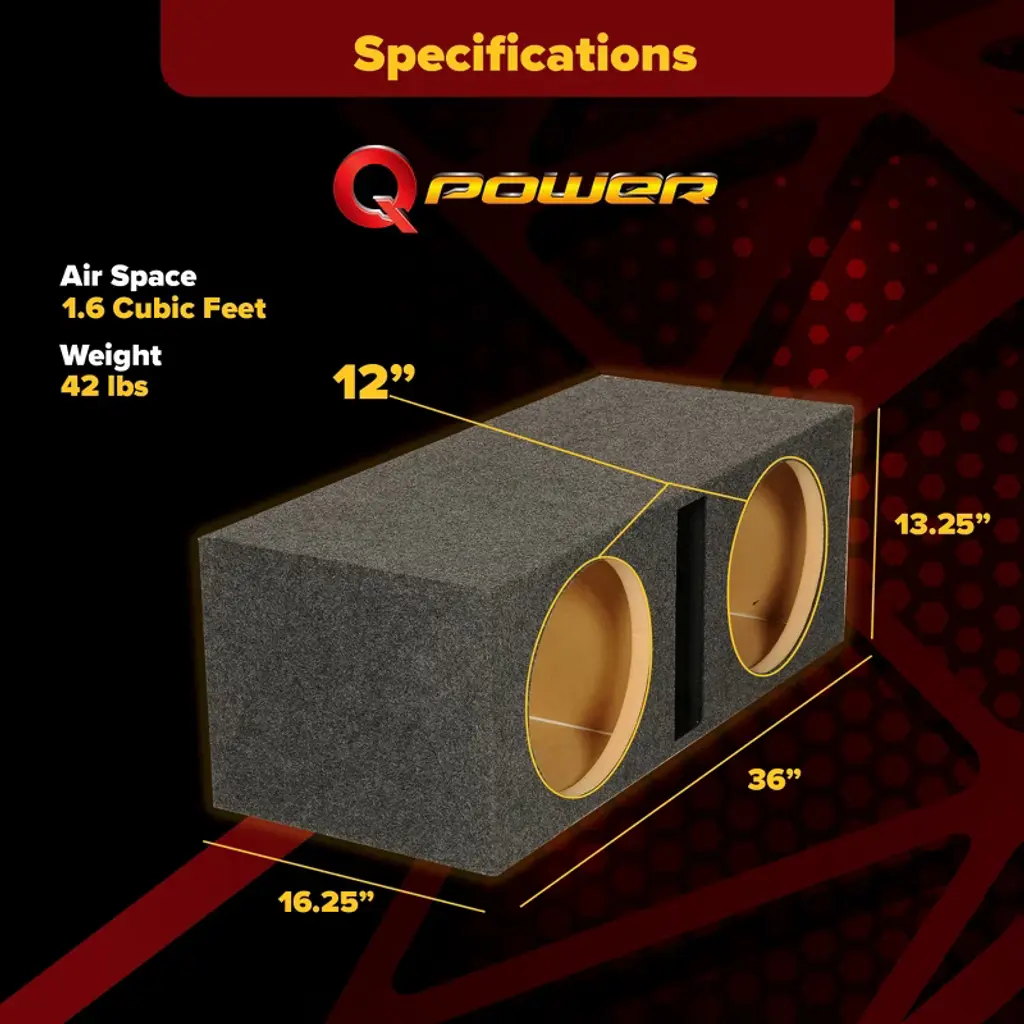 Take your car audio system to the next level with the QPower QBASS Dual 12-Inch Heavy Duty Ported Subwoofer Box. Built to deliver loud, deep, and punchy bass, this high-performance enclosure holds two 12-inch car subwoofers (not included) and is tuned for optimized airflow through a shared slot port vent. Each chamber displaces 1.6 cubic feet for a total of 3.2 cubic feet, giving your subwoofers ample airspace to produce clean, undistorted low frequencies. Whether you’re listening to hip-hop, EDM, or rock, this dual-chamber design enhances output and clarity, helping you feel every beat with powerful precision. Constructed from heavy-duty MDF wood and wrapped in a charcoal gray carpet finish, this enclosure is made to last while blending seamlessly into most vehicle interiors. The durable build helps reduce vibration and supports high-powered bass performance without flexing or distortion. Measuring 16.25 inches deep, 36 inches wide, and 13.25 inches high, the box fits a wide variety of car and truck audio setups. Pair it with your preferred amps and subs to complete a full-range sound system that hits hard and plays loud. Whether you're upgrading your ride or building a custom setup, the QPower QBASS subwoofer box gives your vehicle the bass impact you're after.