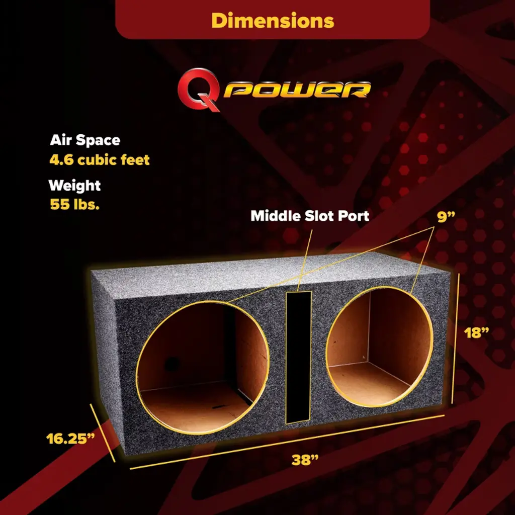 The Q-Power 15-Inch Dual Heavy Duty Vented Subwoofer Enclosure features solid 5/8-inch MDF construction, charcoal carpet covering, a dual vented design, and terminal cup connectors. Turn your ride into an incredible sound machine with the help of the Q Power 15-Inch Dual Heavy Duty Vented Subwoofer Enclosure. If you want the most output for your money, this is the way to go. Q Power provides top quality speaker boxes and accessories, and the QPower QBASS15 is no exception. Impress your friends and family with your 15" woofers that will hit hard in this enclosure!