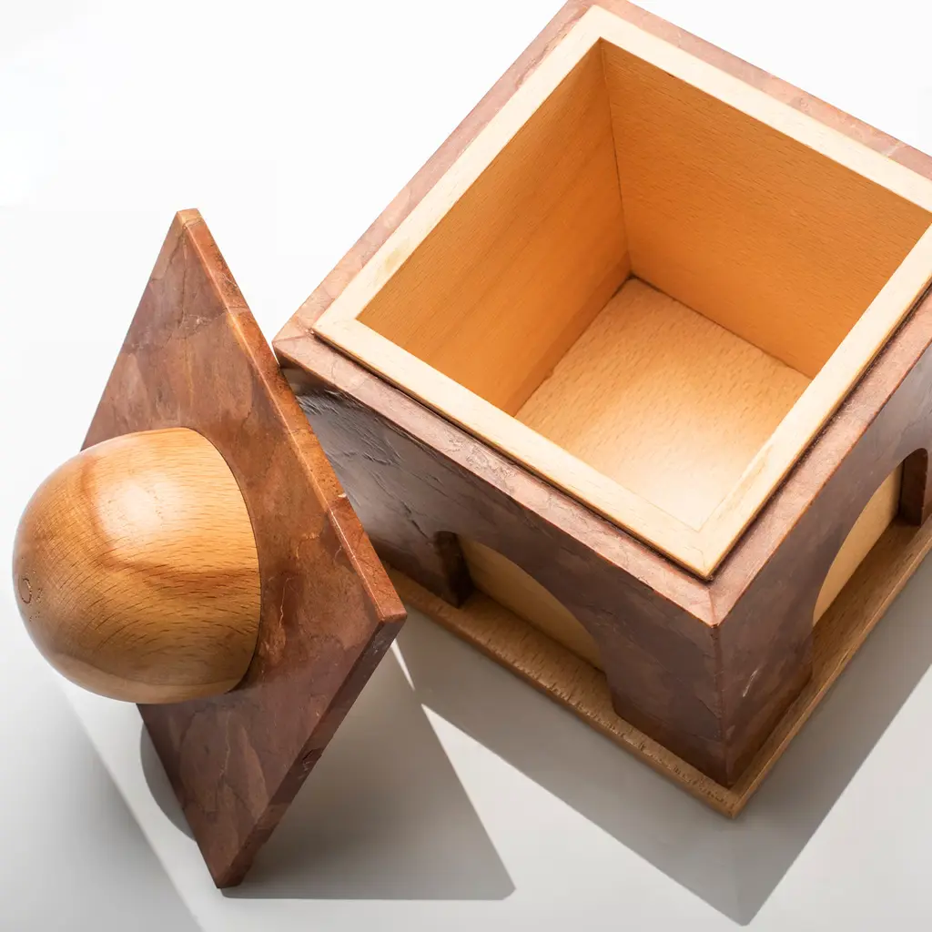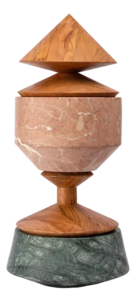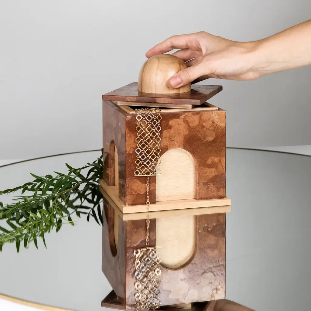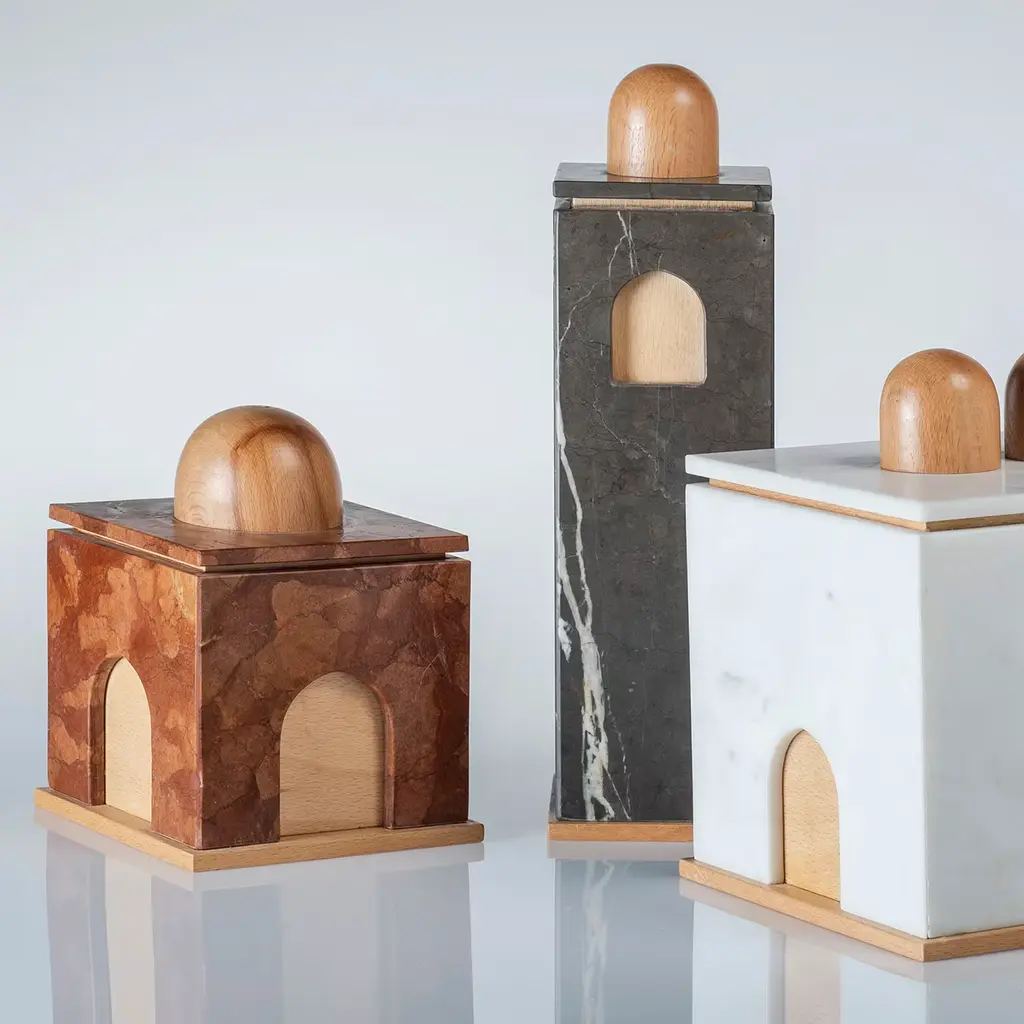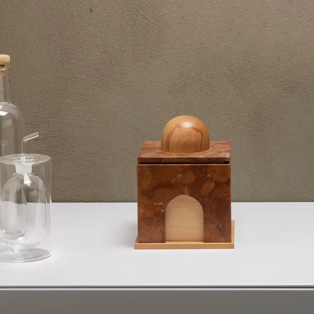 A sublime design of bold architectural value by Gabriele D'Angelo, this box features a traditional mosque structure whose dome serves as the charming yet practical handle of the box's lid. A tribute to Arab-Norman style, it is handcrafted of Red Sicilia marble and wood. Part of a stunning series of three different designs, please ask the Concierge for further details.