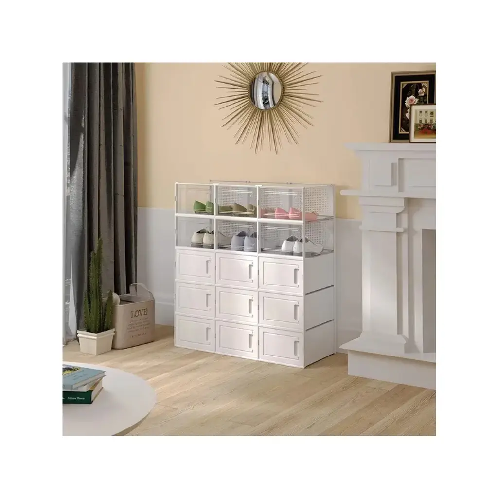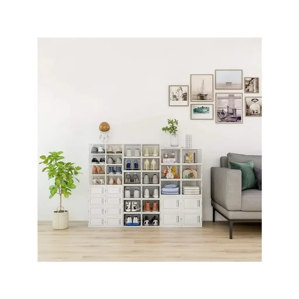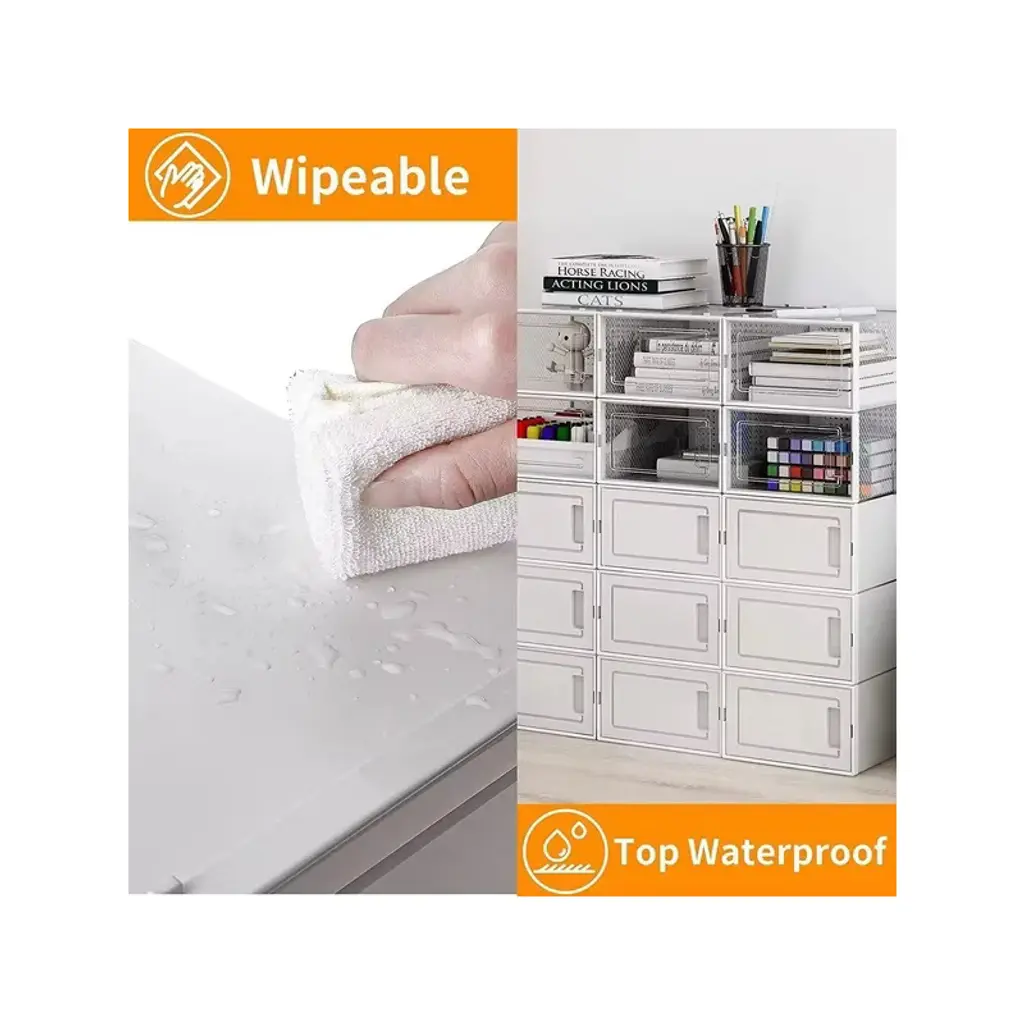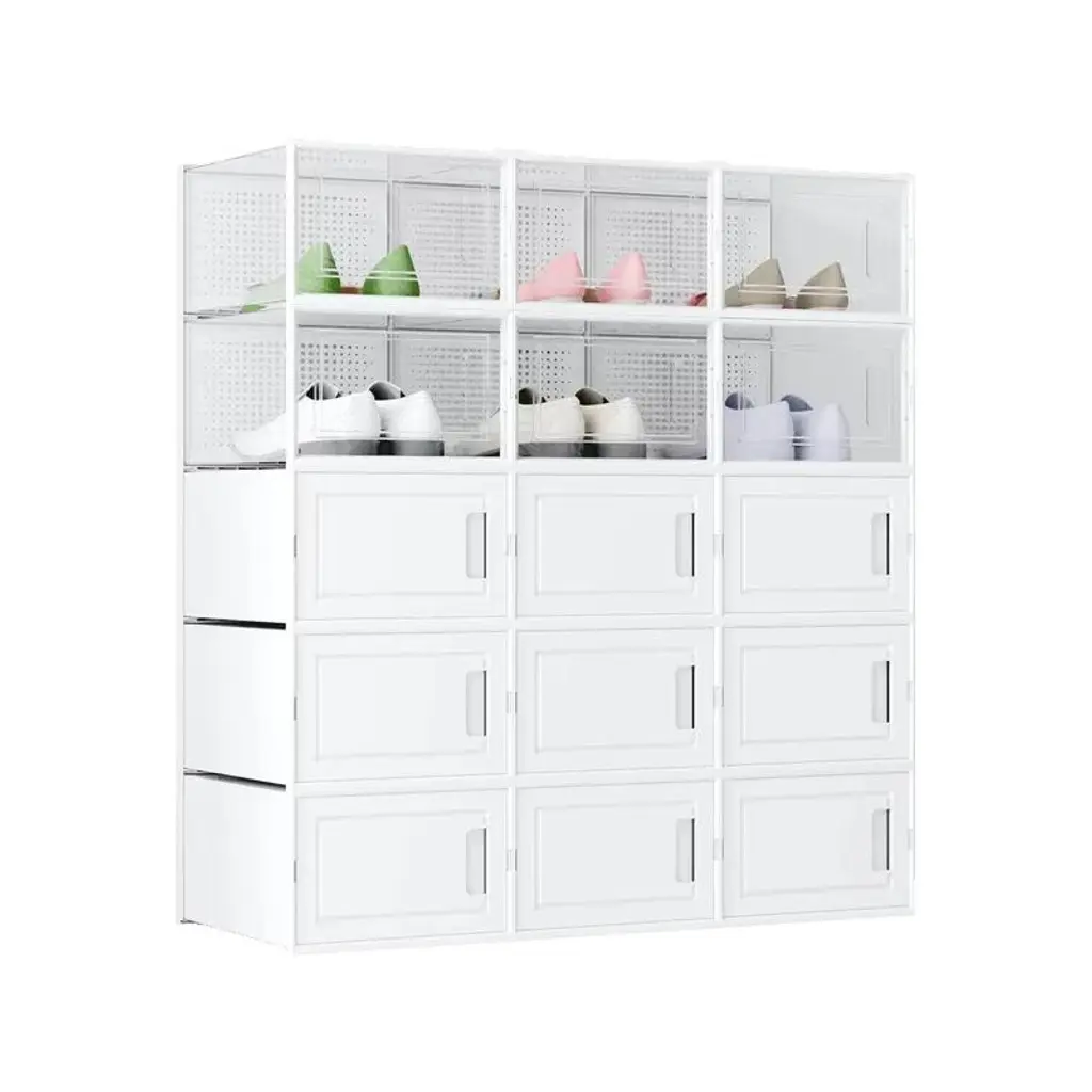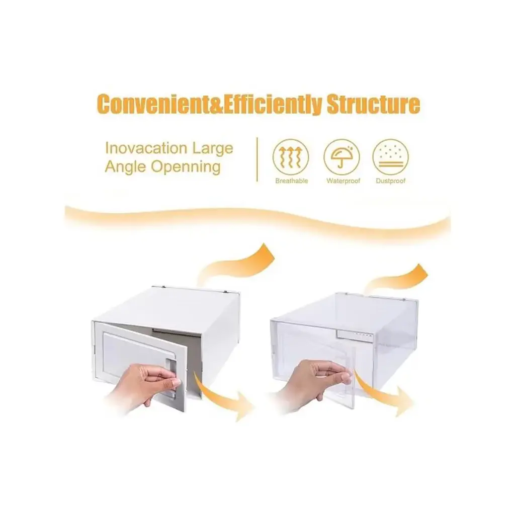 [Large Capacity + Anti-Dumping]Overall Assembled Size: 13(L) x 8.9(W) x 5.4(H) inches, inside size:11.8 inches for men's shoes in sizes 5-9 and 'swomen's shoes in size 5-11. This box is suitable for sneaker, middle heels, low tops, and DIY enthusiasts. Our plastic shoe storage drawer has text on a 45-degree tilt, made in groups of 15 packs, this stackable shoe box is a great choice.[Soild ABS+Ventilation ]Strong Plastic and Soft ABS of Full 15 pairs shoe organizer Can bear a capacity of over 30kgs.In addition, the plastic board will keep its shape and prevent deformation, so it is more reassuring. We Adopt a rear vent design to circulate air and prevent peculiar smells. Don't worry about the smell in your new shoe container. It is a waterproof Shoe Holder, easy to clean, durable and washable.[Transparent Shoe Box]With a completely clear door, the clear plastic stackable closet allows for easy viewing of the contents within. You can easily identify its contents, But it's not limited to that!.Ideal for organizing shoes, clothing, crafts, toys and even collectibles to show.[Management Space]Stacking Storage Shoe Box to help organize closet and living area easily, you can stack them or put drawers in any free space for storage, such as above cabinets or under clothes, under stairs, under beds, folding shoe box design makes each one easy to put together and folds into shape. When not in use, it quickly unfolds for easy and convenient storage to save space.[Side-Pull Front Door]Stackable shoe organizer bins keep your shoes dust free and organized with these convenient bins. The easy-to-grab side-pull front door allows you to quickly grab your favourite pair of shoes. When you want to move them, it will not open the side door or loosen and cause things inside to fall off. Also won't be easy to open the side door because of the squeeze.