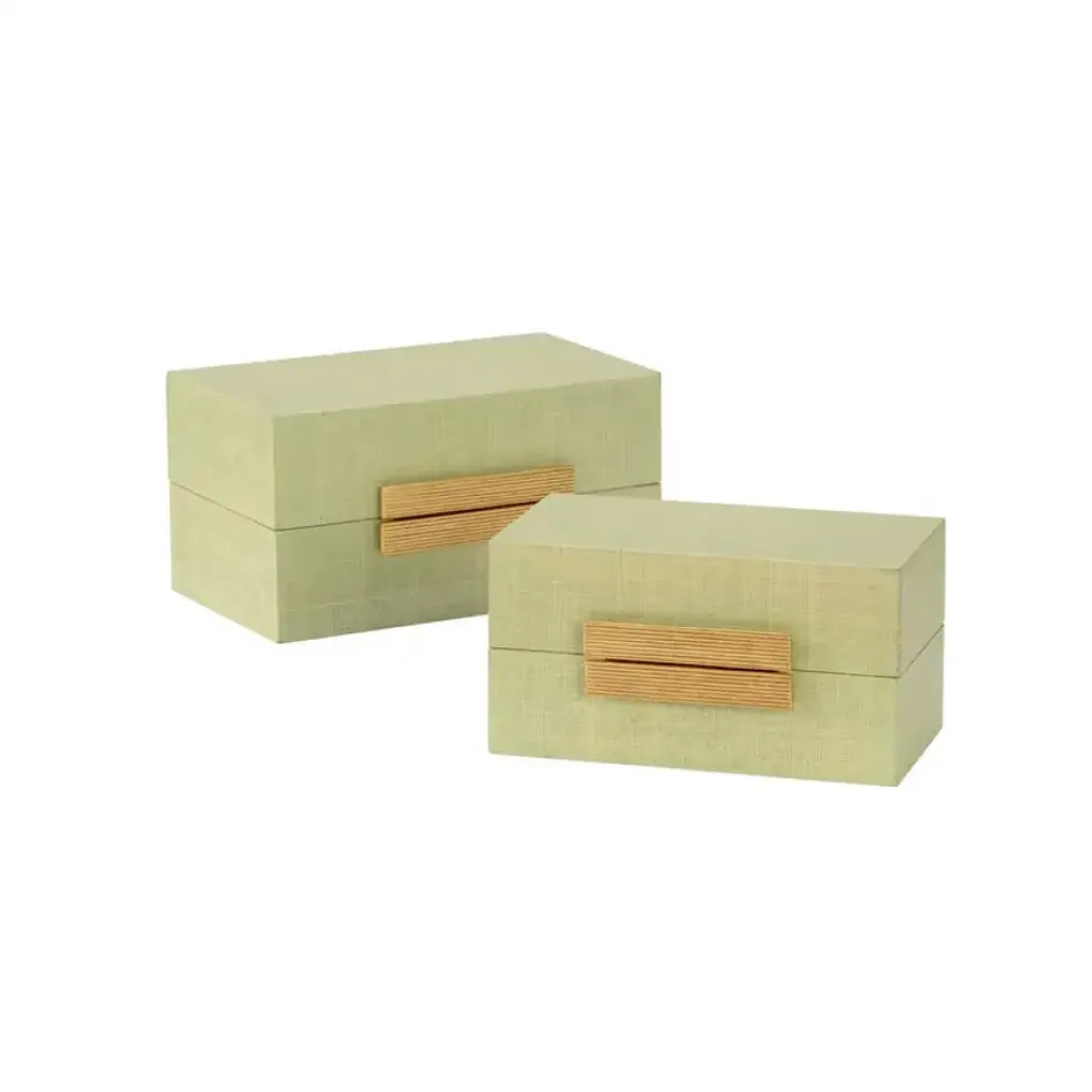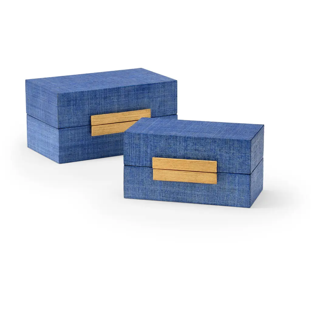Wonderful Set Of Two Boxes Covered In Raffia With Gold Leaf Finished Hardware. Small: 6.25h X 11.5w X 6.75d