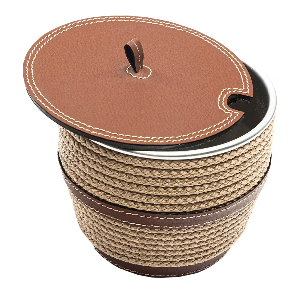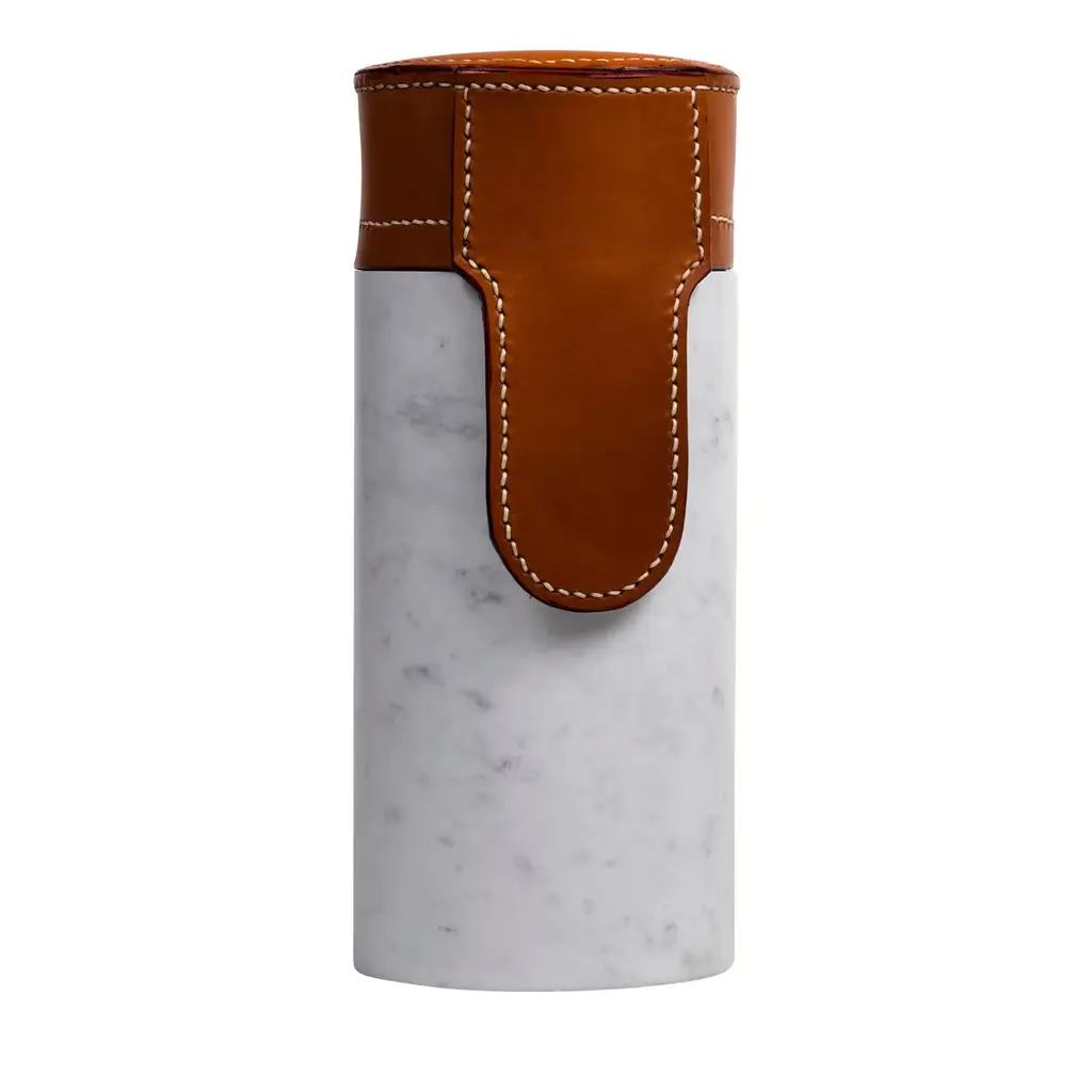 Ravello is a minimal bathroom collection ideal for any setting. The rigid cylindrical main volumes are rendered softer by the smooth decorative rounded edges, while the finest Italian leather, with its velvety texture, is combined with one among three finishes of choice (polished chrome, brushed bronze and brushed brass) for a naturally elegant resulting design. Partially leather-covered metal structure. Non-slip waterproof rubber base underneath.