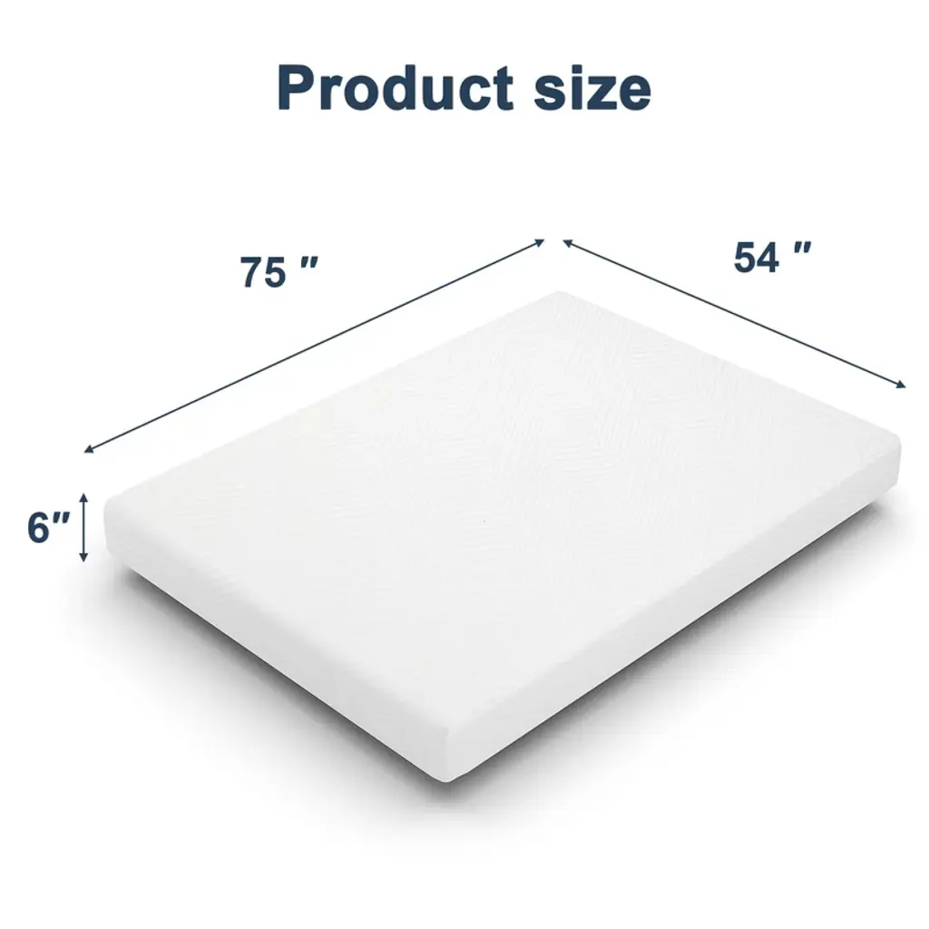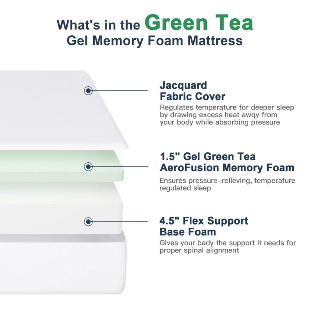 Resenkos Full Size Memory Foam Mattress In A Box, 1.5" Gel Green Tea Aerofusion Memory Foam, 4.5" Flex Support Base Foam, Soft Touch, White 6"