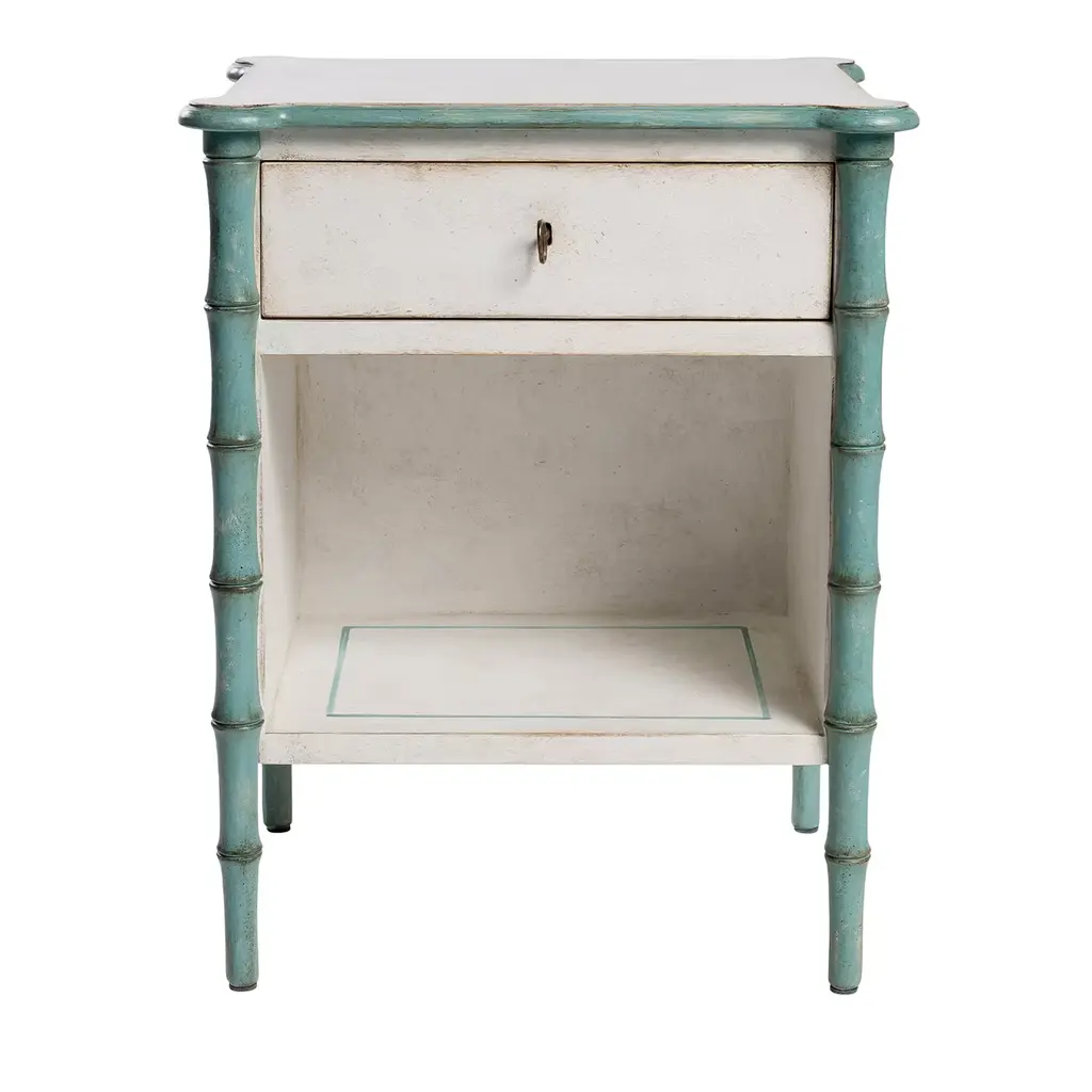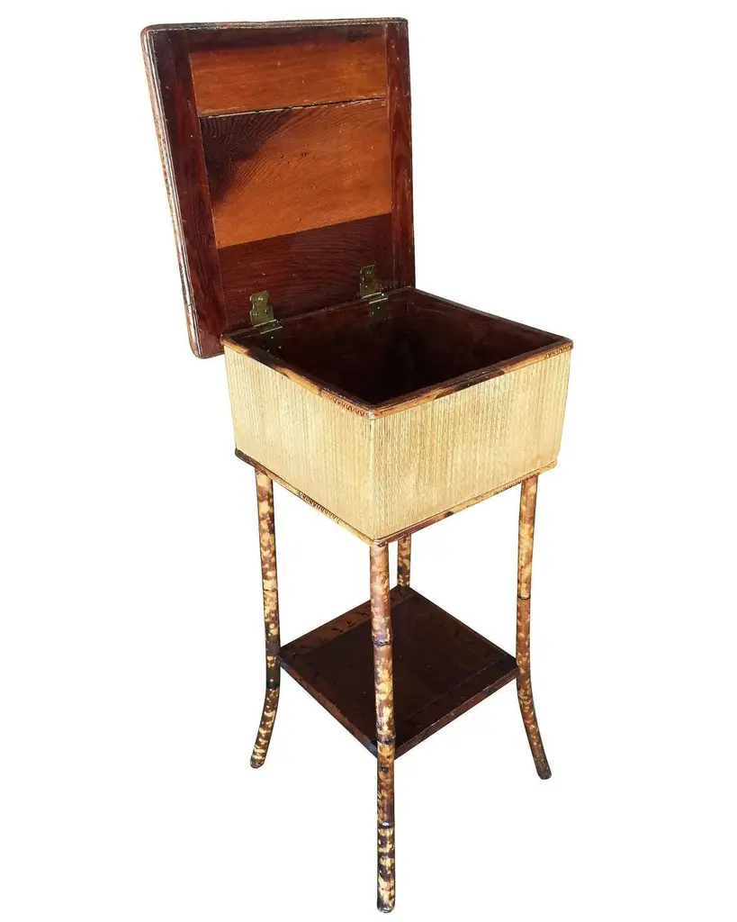 Antique tiger bamboo pedestal side table with rice mat top with flip-open lid storage and a secondary bottom shelf.1950, United StatesWe only purchase and sell the best and finest rattan furniture made by the best and most well-known American designers and manufacturers, including Ritts Company. (Herb Sr. and Shirley Ritts) Tropitan Seven Seas Rattan Paul Frankl Tropical Sun Rattan These designers and companies helped to popularize rattan furniture in the United States during the 1930s through the 1960s.Shirley Ritts was the mother of the photographer and music video director Herb Ritts Jr. Shirley Ritts was born in Baltimore, Maryland, on October 28, 1920. Herb Ritts Sr. also invented the "S springs" under the cushions in the early 50s and replaced the wrapping with preformed plastic.Paul T Frankl came from New York just before the Depression after a great run designing his renowned Skyscraper furniture line. He designed and decorated the homes of Hollywood’s top stars and producers from his Beverly Hills shop.Paul Laszló was a Hungarian-born architect and interior designer whose work spanned eight decades and many countries. László built his reputation while designing interiors for houses in the 1950s to 60s, including rattan furniture in his own style.C.W. Fishbeck started Tropical Sun Rattan of Pasadena in 1905. Tropical Sun produced top-quality real rattan furniture in the Philippines, where most of the above designers also had their designs made. He had showrooms across the country.We have in stock at this time a vast array of rattan from all of these designers, decorators, and architects; their sofas, chairs, and tables, and just about all their designed products from the 40s through the 60s.We would be happy to make you Custom cushions in C.O.M. (Customer's Own Material) are available for a small fee. Simply supply the fabric and we will have the cushions made for you before delivery. If you need help sourcing fabric, we can help! Also small fee. All rattan, bamboo, and wicker furniture has been painstakingly refurbished to the highest standards with the best materials.All refinishing is done by rattan workers with over 30 years of experience. Every wrapping and joint has been inspected by “The Rattan Man,” Harvey Schwartz to guarantee you the finest product available, to enjoy for years to come in your home or office. Harvey Schwartz is the leading expert in vintage rattan and the author of "Rattan Furniture: Tropical Comfort Throughout the Home." Signed copies are available on request for $39.99 USD. The hardbound 160-page full-color book details the fascinating History of rattan with photos of wonderful vintage and modern-day tropical décors and rattan. The book is great for any newcomer to rattan wanting to learn, as well as a top resource for dealers and designers alike.