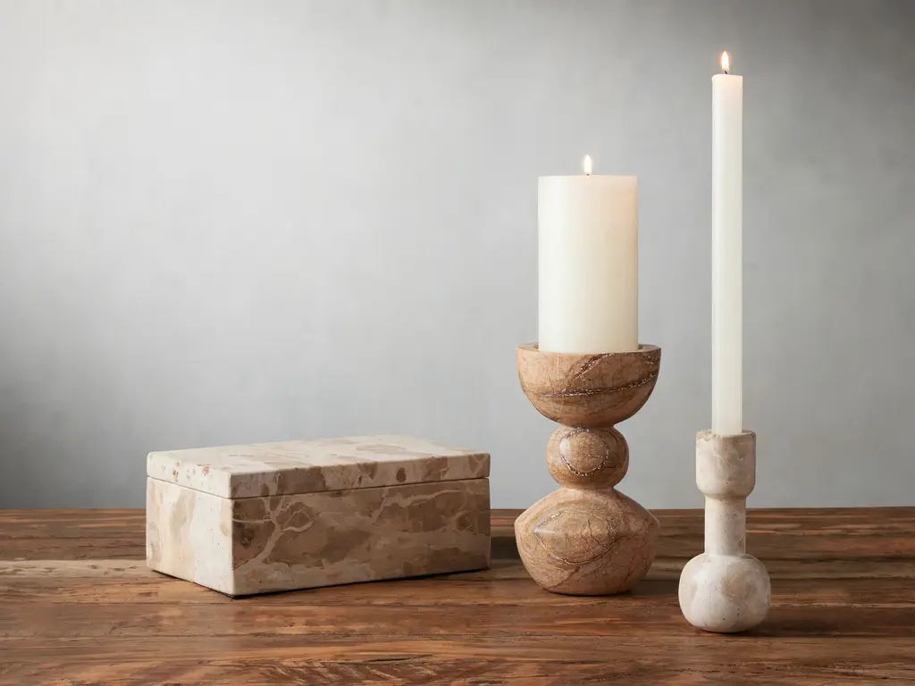 Crafted from natural marble, our Rhodes Collection features elegant pieces that are sculpted and finished by our artisan partners in India to accentuate every unique vein, color, and marking. Elevate your décor with Rhodes’ stunning modern sculptural aesthetic, from candle holders to centerpieces, barware and décor accents for any space. Hand-carved from marble by artisan partners in India. Natural marble will vary in color and pattern, making every piece unique.