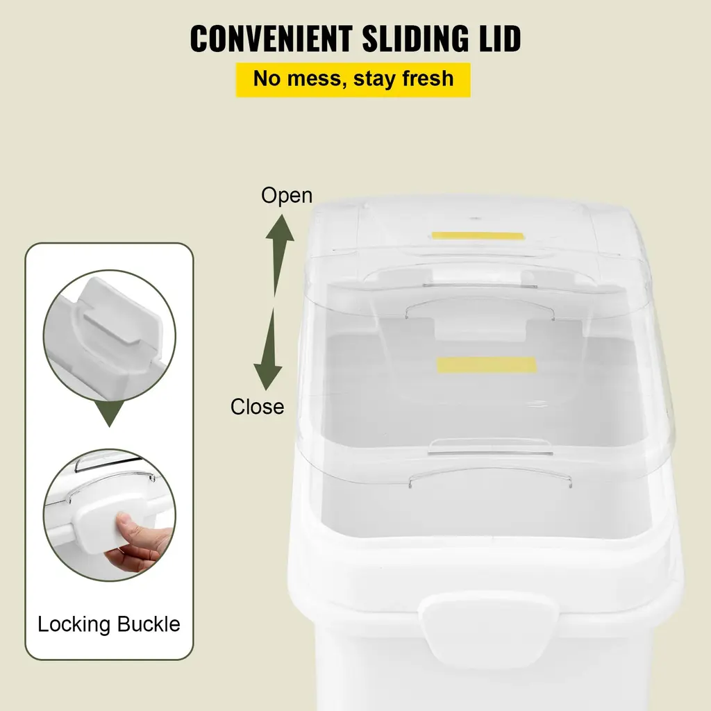 Extra-large & Space Saver: Maximize your storage with this rice storage container! Depending on the size and density of your dry goods, it can hold approximately 44 pounds of rice or 22 pounds of pet food./70 pounds of rice or 35 pounds of pet food./140 pounds of rice or 70 pounds of pet food / Note: The capacity will vary depending on your dry food's size, shape, and density. 100% Airtight Design: Keep your food fresh and protected with the secure latches. This kitchen ingredient bin is perfect for keeping out damp and flys, making it ideal for storing dry foods. Food Grade PP Material: Made from BPA-free, non-toxic, food-grade PP material, this dog food bin is not only durable but also safe for storing pet and human food. It's also easy to clean. Visible Lid & Rollers: The clear lid allows you to quickly check the remaining amount of food. The cat food storage container also features universal detachable wheels for easy mobility. You can also store your seasoning bottles on the flat top, and stack containers vertically to save space. Multi-Purpose Container: Get ready to store a variety of items, including dog food, pellets, seeds, snacks, flour, rice, nuts, legumes, grains, sugar, and more. It's versatile enough to store human food, office supplies, toys, and other items you might have. Package Content 3 x Food Storage Containers 12 x Wheels 3 x Scoops 3 x Transparent Covers 1 x Manual (1 x Food Storage Container 4 x Wheels 1 x Scoop 16 x Screws 1 x Manual)for 140 pounds of rice or 70 pounds of pet food/175 pounds of rice or 88 pounds of pet food option