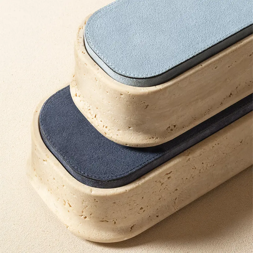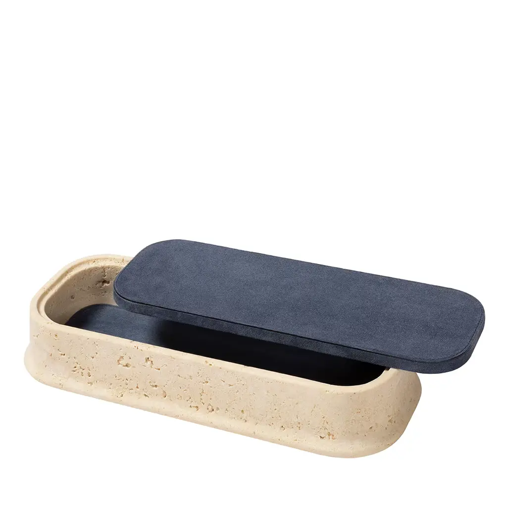 The essential lines and soft volumes of this collection fully enhances the beauty of travertine. Available in several nuances of choice, and provided with removable leather placemats, the Rodi boxes play with solids and voids, light contrasts, and color matches. Custom sizes are available on request. Travertino finishes available: Travertino Classic, Travertino Walnut, Travertino Titanium, Travertino Yellow, Travertino Red.