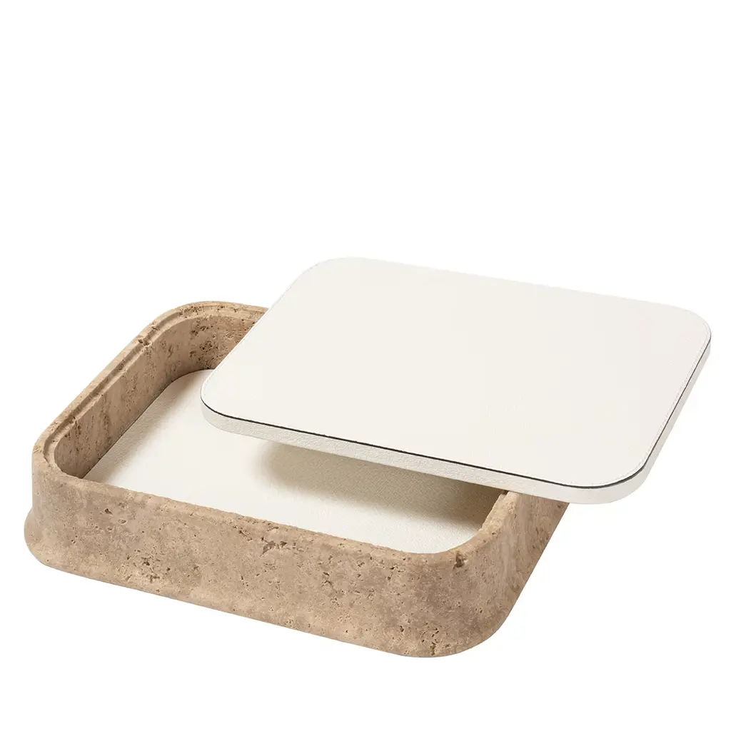 The essential lines and soft volumes of this collection fully enhances the beauty of travertine. Available in several nuances of choice, and provided with removable leather placemats, the Rodi boxes play with solids and voids, light contrasts, and color matches. Custom sizes are available on request. Travertino finishes available: Travertino Classic, Travertino Walnut, Travertino Titanium, Travertino Yellow, Travertino Red.