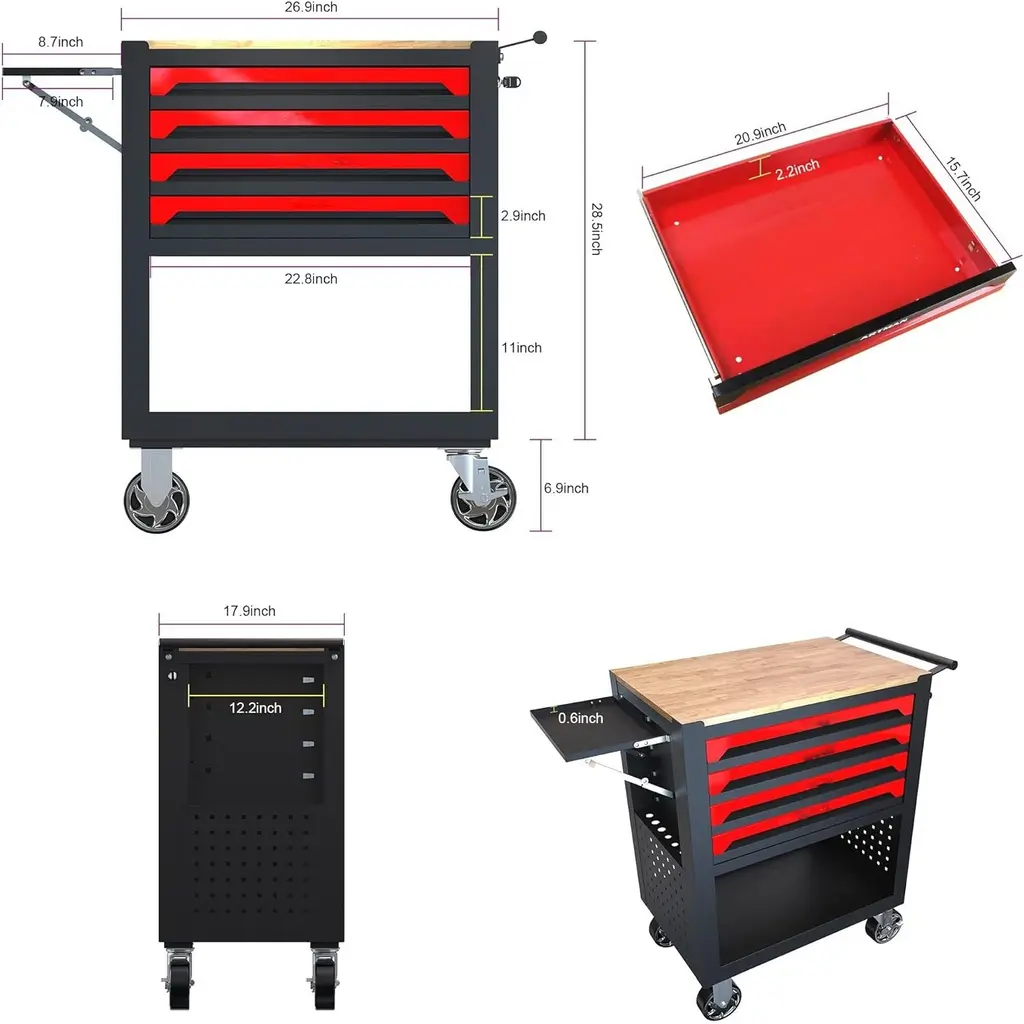 Rolling Tool Chest: This rolling tool car includes a premium-quality wooden top and portable small tabletop on the sides, 4 drawers, 4 universal wheels (two with brakes), and a storage rackWith 4 drawers: 4 drawers with keys and locks, ensure that your toolbox has a locking mechanism to protect items.Multi functional storage space: The toolbox has four drawers and an open storage space, providing ample storage space and allowing you to classify tools.Easy to move tool chest: Four 5-inch 360 degree rotating casters allow you to operate the toolbox wherever you need it, with two of them equipped with brakes to prevent chest movement while working.Various application: This toolbox with a large storage capacity has a perfect design and sturdy quality, suitable for workshops, garages, warehouses, etc. This is a great gift for gentlemen on holidays, birthdays, and anniversariesDescription:Name: Tool ChestMain material: MetalProduct size assembly length (unit:) 30.30Assembly width (inches): 17.90Assembly height (inches): 35.40Weight: 93.00 poundsPackage size length (inches): 25.80 width (inches): 19.00 height (inches): 30.70Weight (pounds): 100.00Product features: Garage organizer trolley and 4-drawer toolbox, large capacity storage cabinet, adjustable shelves, used in warehouses and workshopsFeatures:1. Made of premium-quality steel bars, this tool storage organizer is for heavier items and stable for long-term use. Due to its heavy steel structure, it can accommodate up to 400 pounds of tools, with a load of 100 pounds per drawer.2. Side handle: Equipped with a side handle, it is comfortable and helps to move the cart easily.3. The drawer is equipped with smooth ball bearing sliders for easy opening and closing. The wooden top workbench provides you with an instant workbench. A small scalable side table can also be used to store objects. The entire tool cabinet can carry a load of approximately 660LBS (you can sit on it).Packing list:1 x Tool Chest, with installation instructionsNote:Different displays may cause the color of the item in the picture a little different from the real thing. Manual measuring,please allow 1~3mm error,thank you.